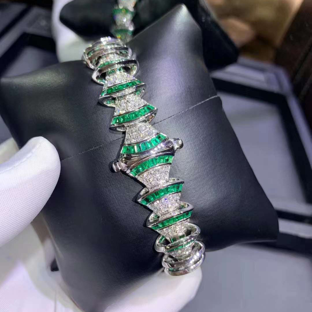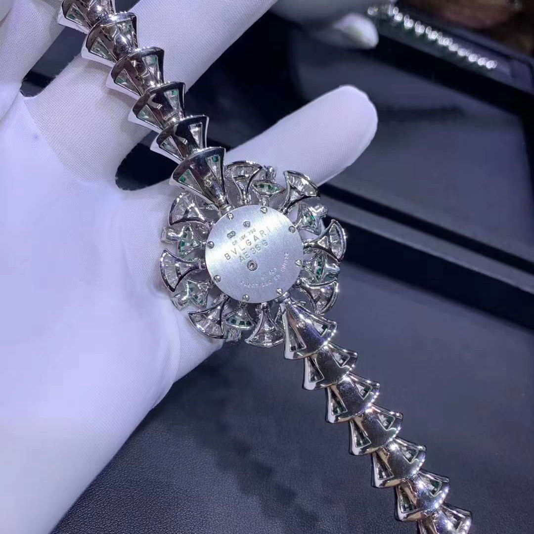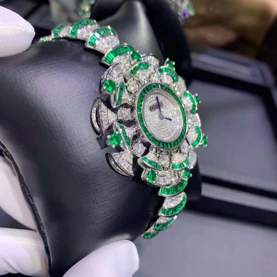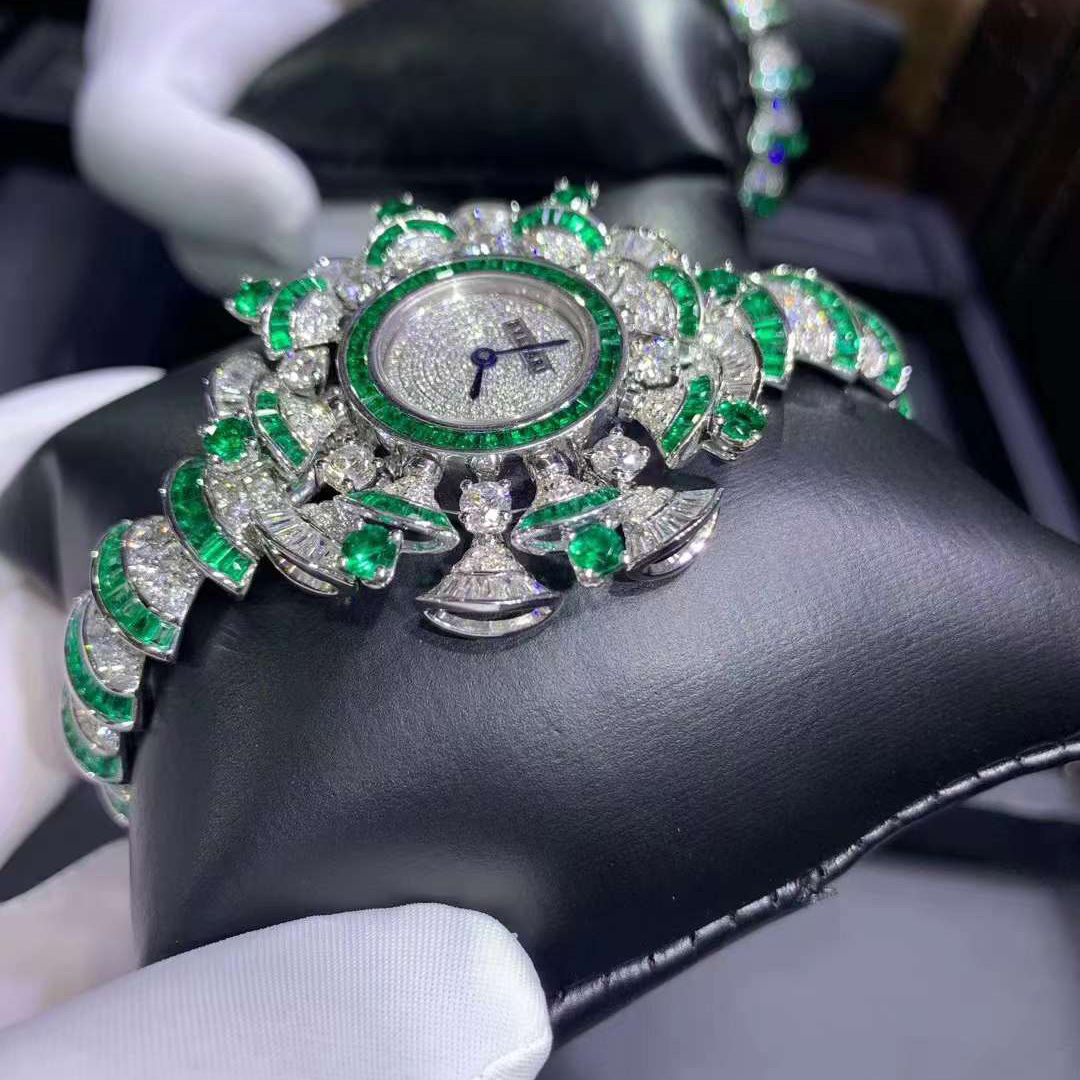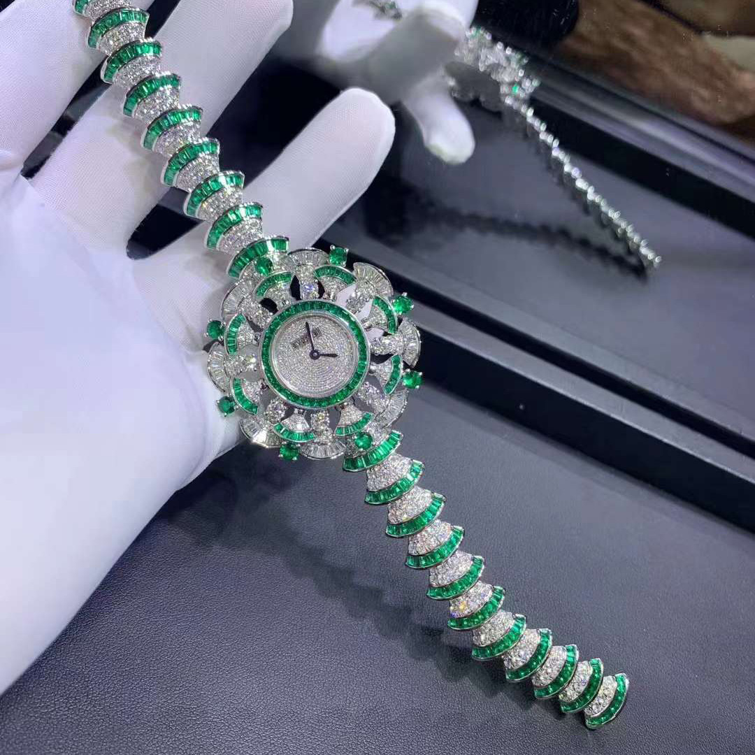 DIVAS’ DREAM watch with 18 kt white gold case set with baguette-cut diamonds and emeralds, and brilliant-cut diamonds and emeralds, snow pavé dail, 18 kt white gold bracelet set with brilliant-cut diamonds and baguette-cut emeralds.