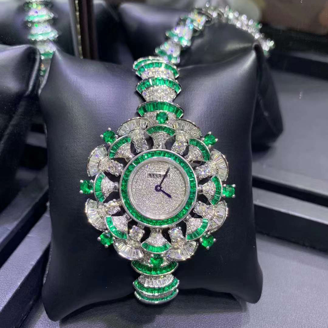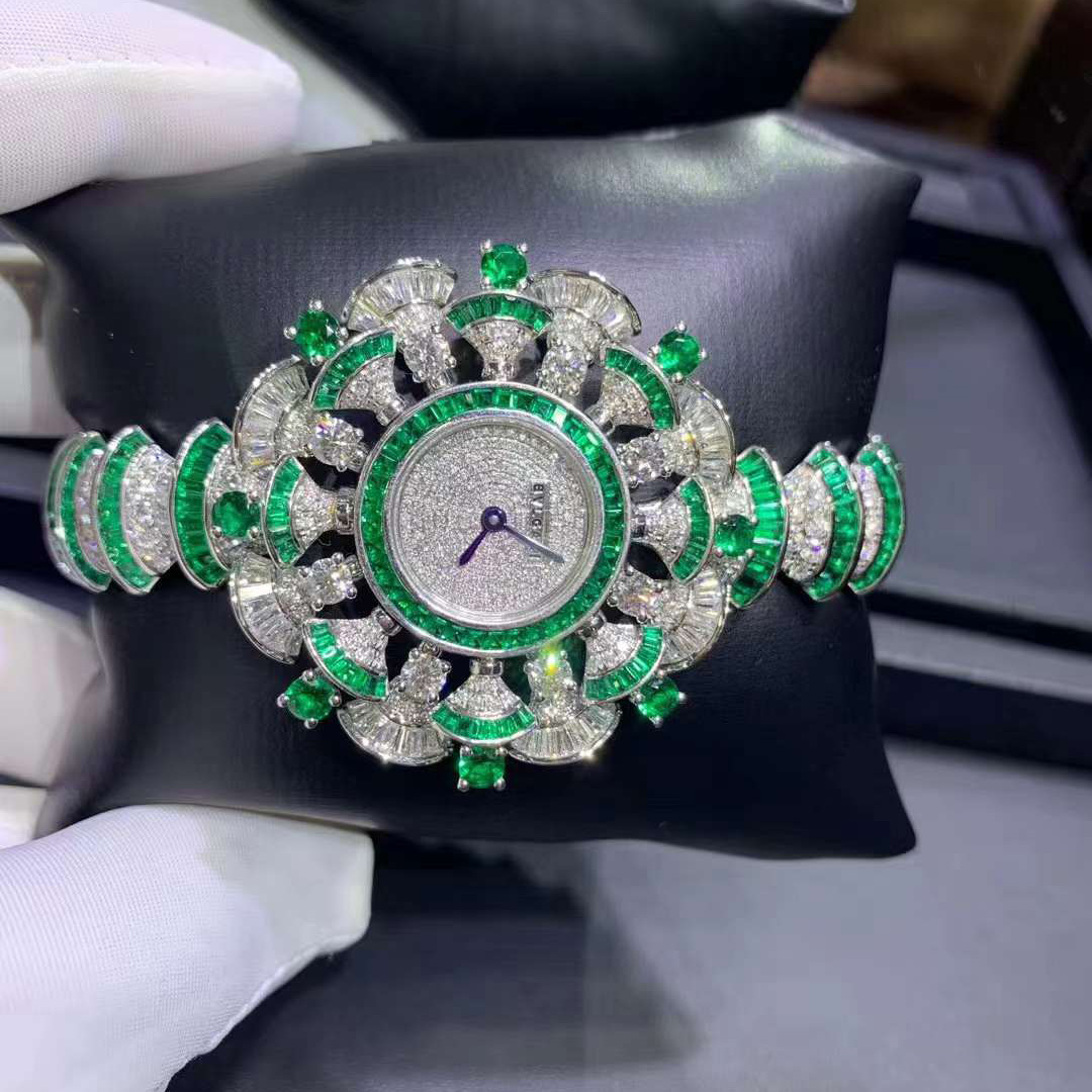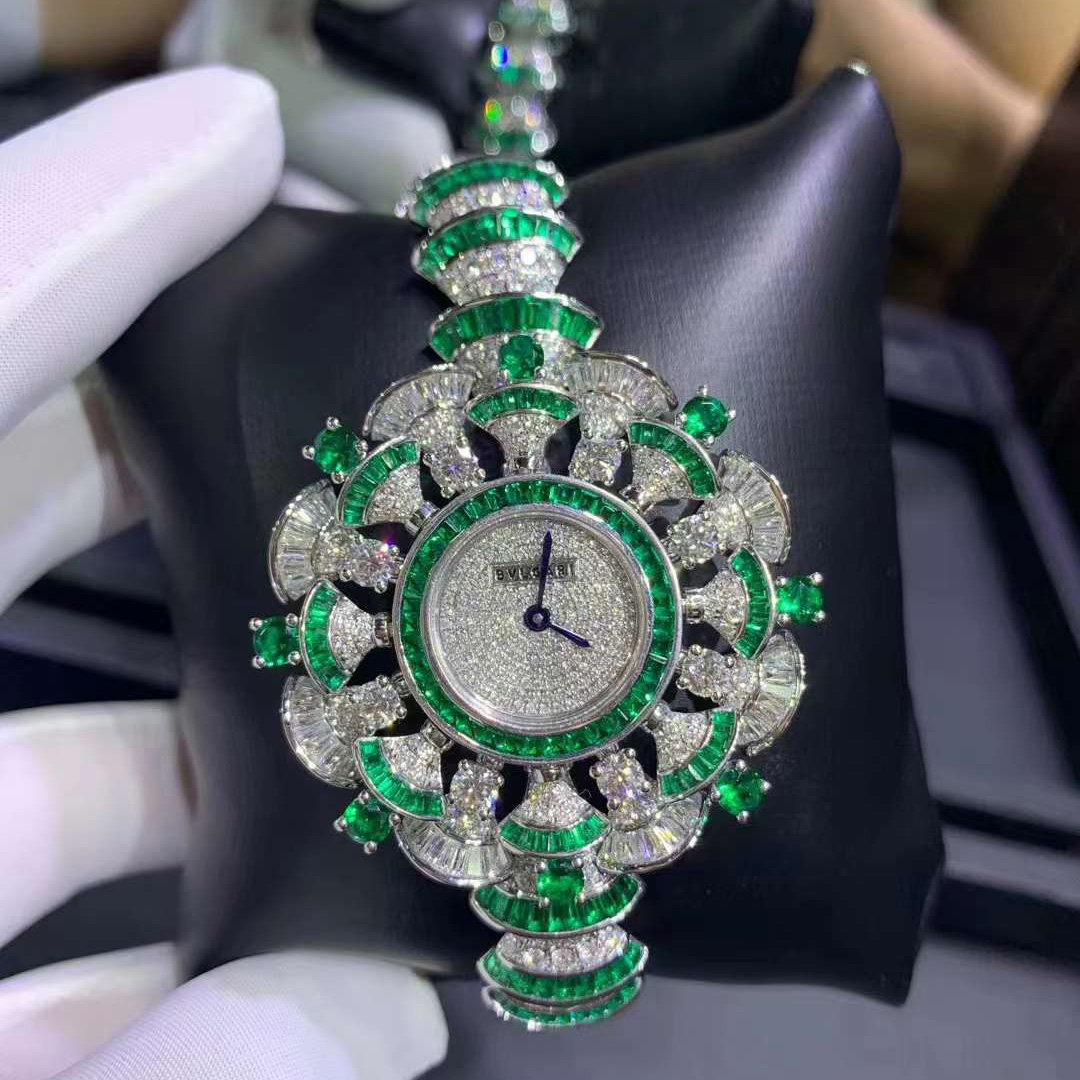 Framing the radiance of a gleaming dial with the delicacy of the iconic fan-shaped motif, the DIVAS’ DREAM timepiece reveals the multifaceted shades of contemporary women. Inspired by feminine elegance and by the enchanting allure of the eternal city, the DIVAS’ DREAM timepiece pays homage to the most glamorous divas with an unmistakable Roman spirit. Quintessentially feminine and refined, the jewelry watch is sculpted capturing the charm of the Caracalla Baths marble and the sensual curves of its fan-shaped mosaics, reflecting the very essence of Italian beauty. DIVAS’ DREAM watch with quartz movement, 39mm 18 kt white gold case set with baguette-cut diamonds and emeralds, and brilliant-cut diamonds and emeralds, snow pavé dial, 18 kt white gold bracelet set with brilliant-cut diamonds and baguette-cut emeralds.