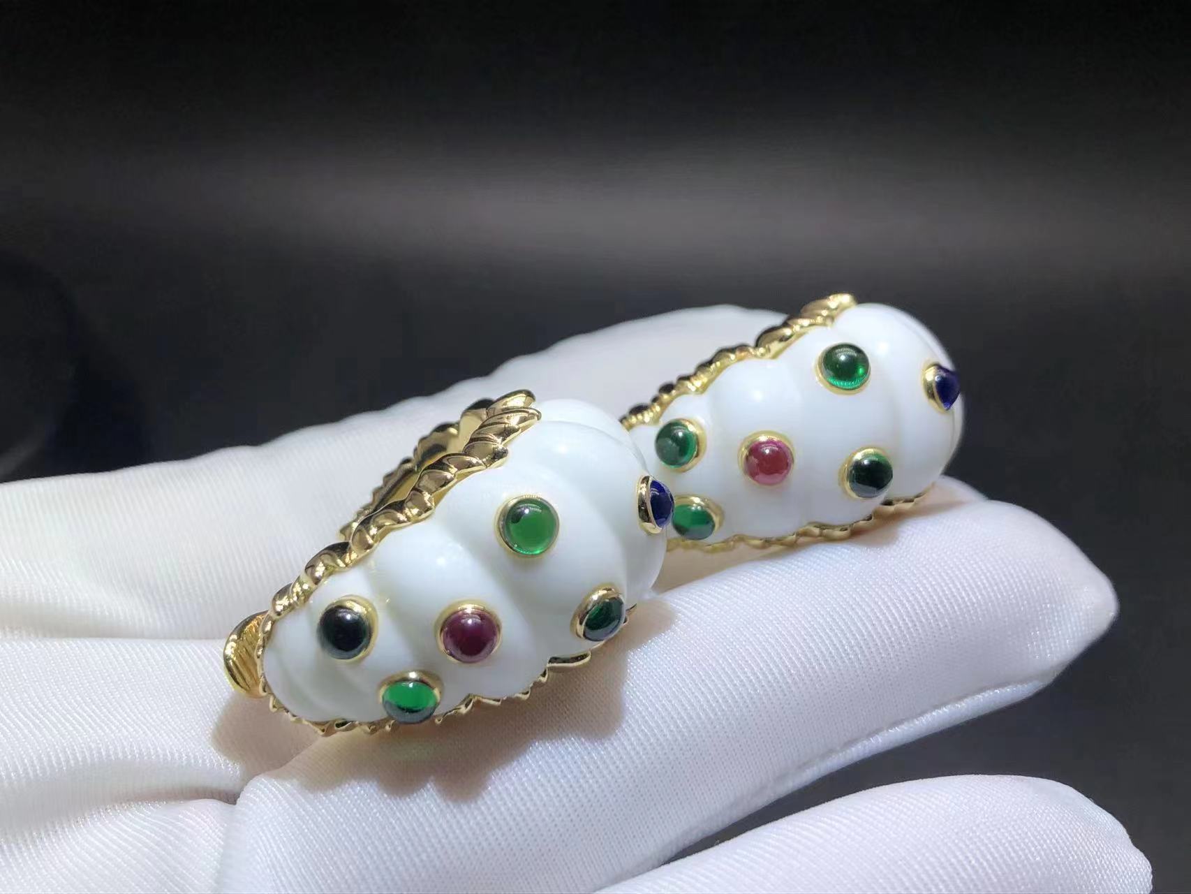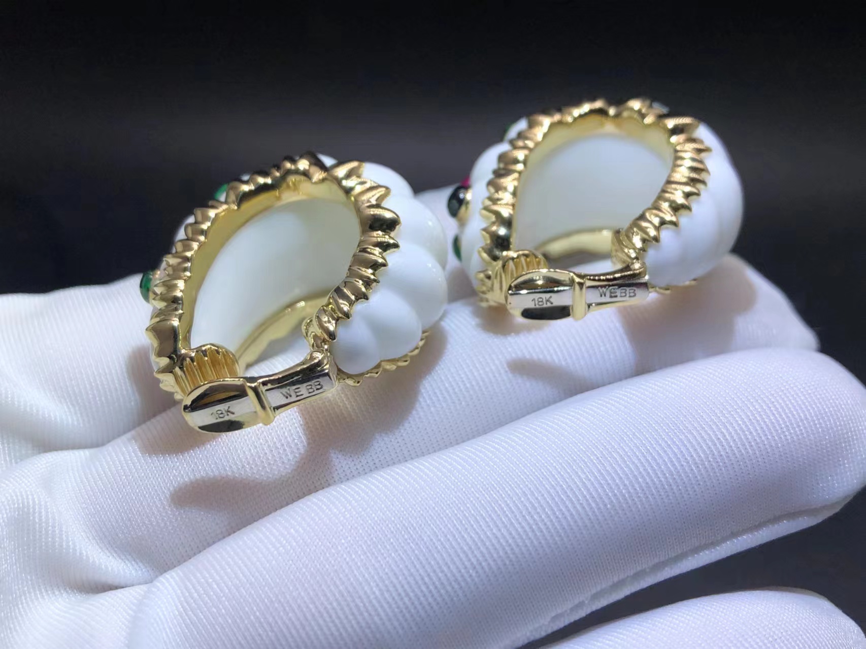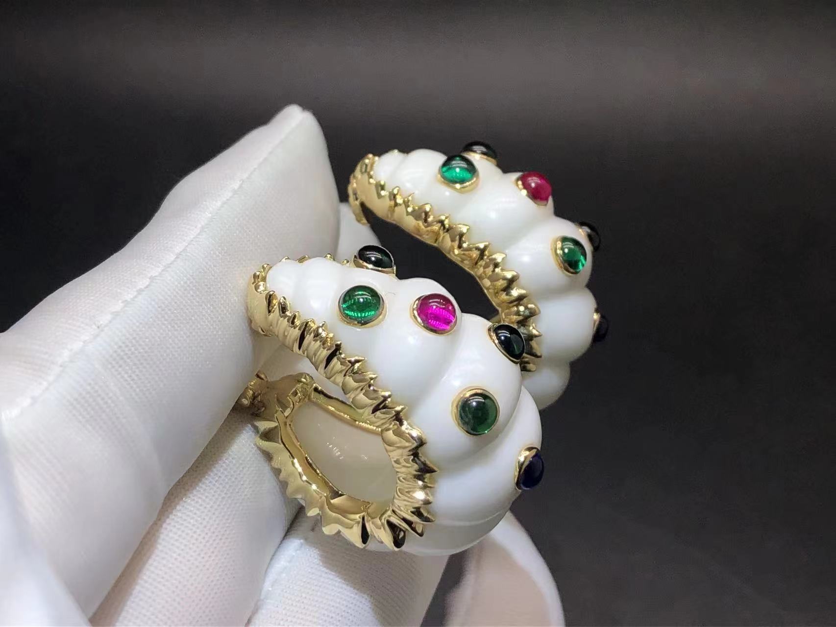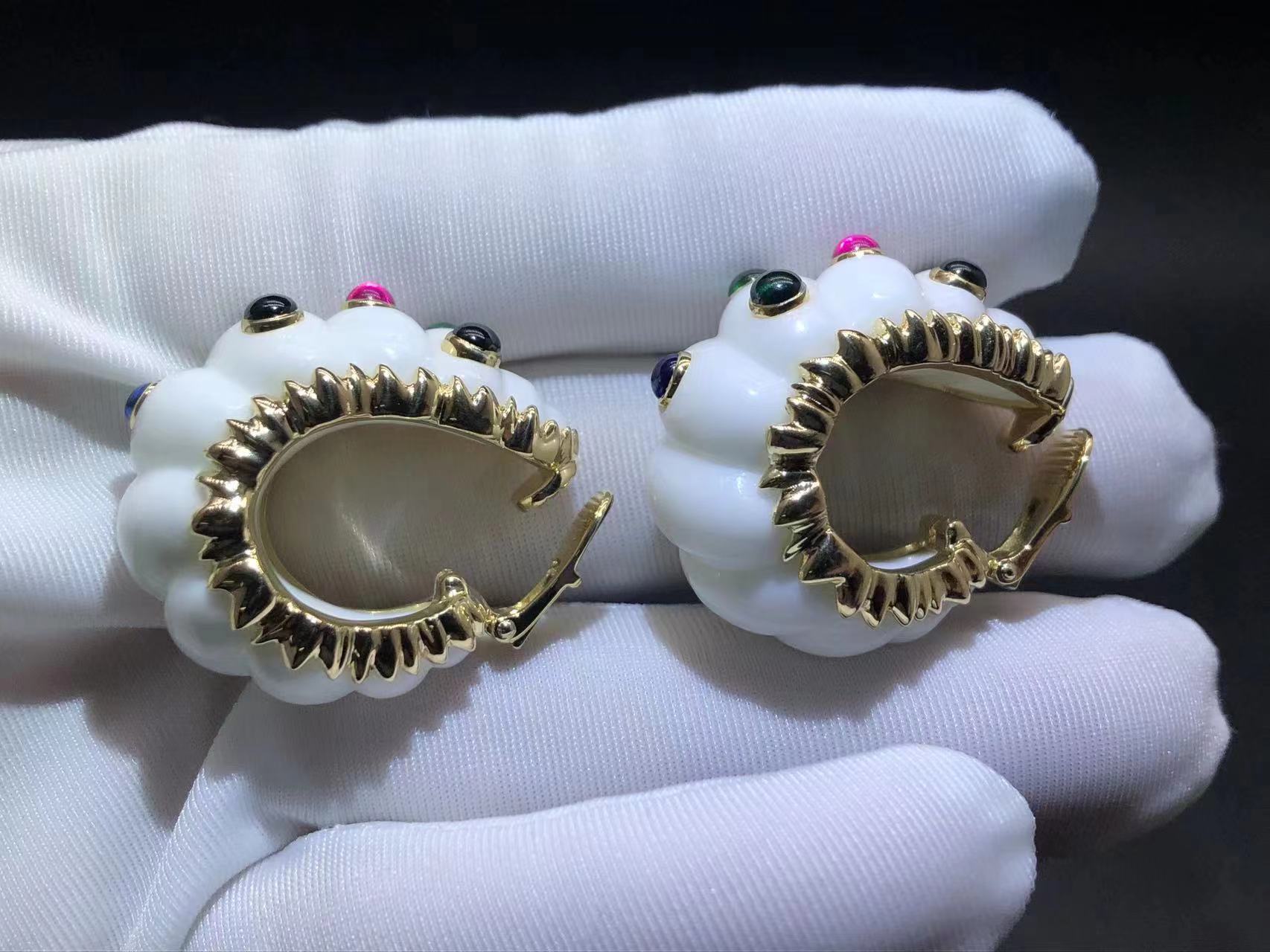 This David Webb in White Coral Hoop Earrings are made of 18K yellow gold, White coral hoops, emerald hemispheres, sapphire hemispheres and ruby hemispheres.
