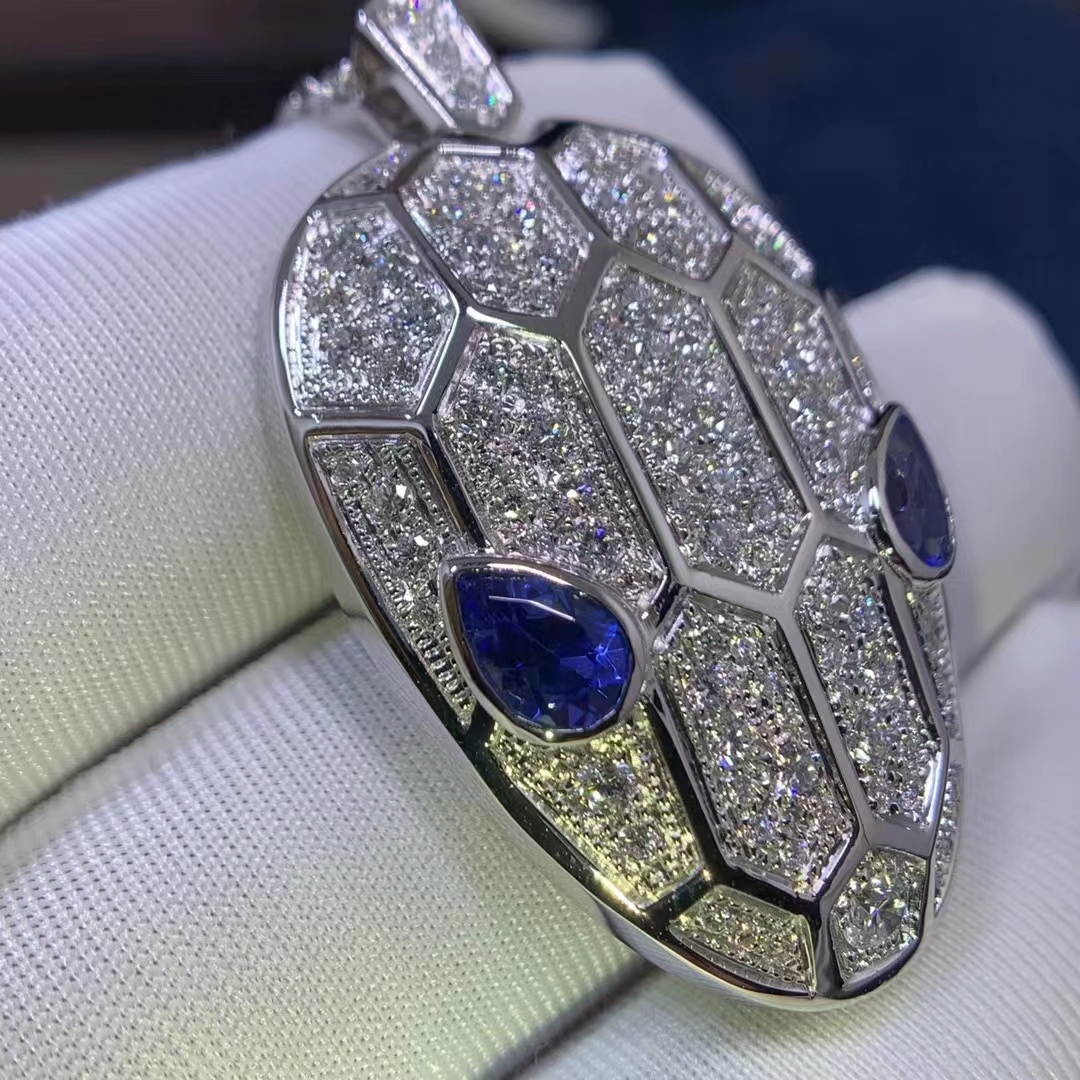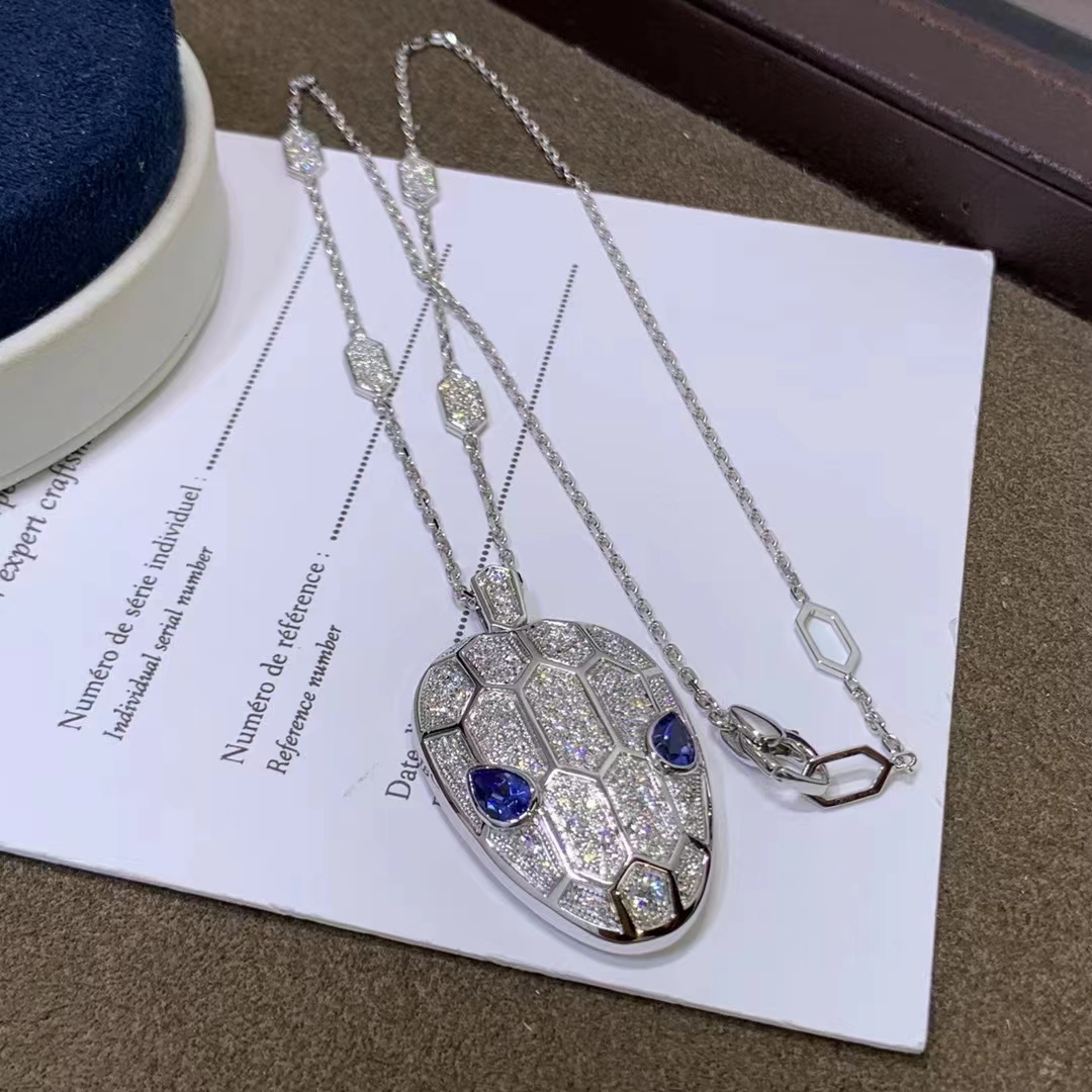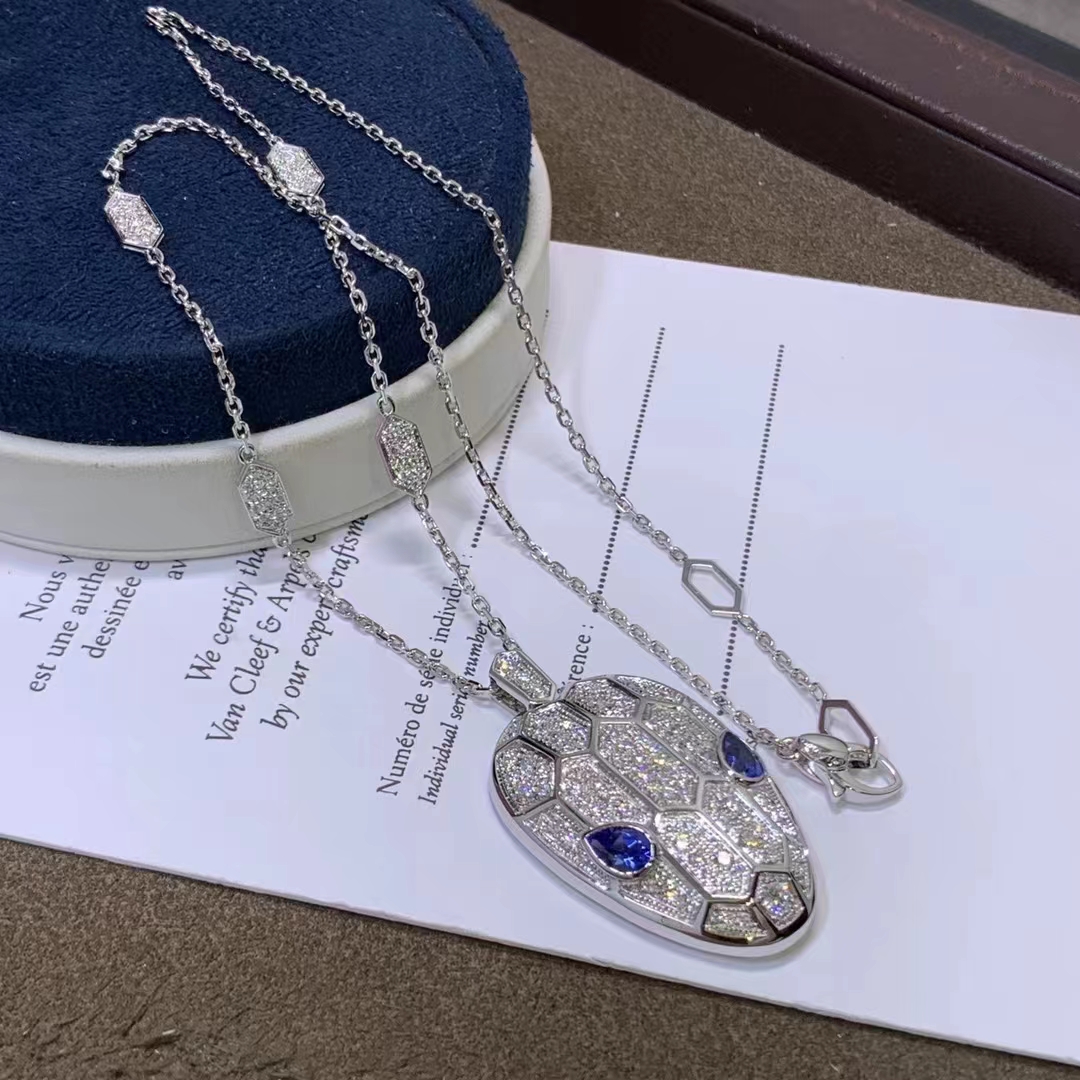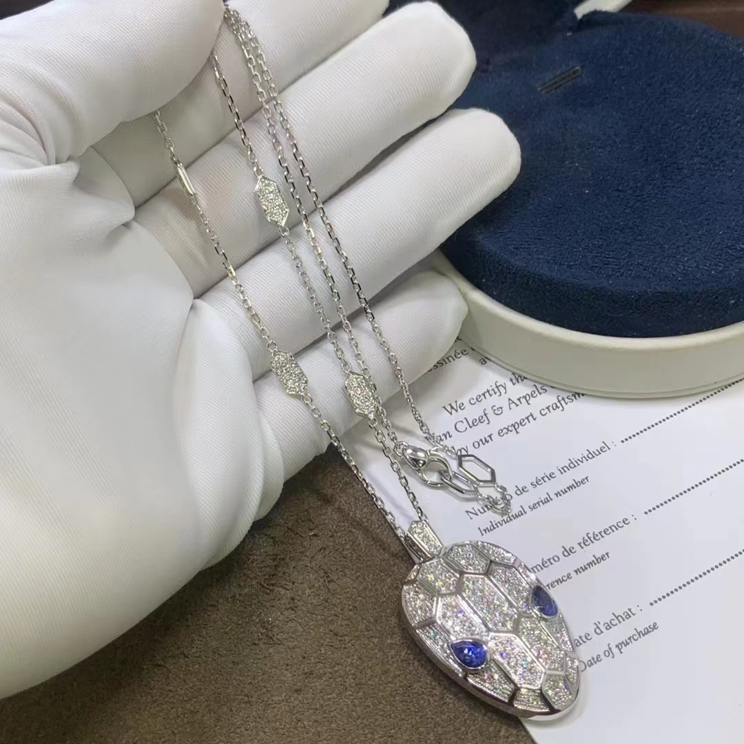 Capturing the power of attraction, the Serpenti necklace glorifies the head of the snake in a jeweled design that sparkles with glamour and sophistication. Inspired by the sensuality of a woman’s gaze, Bulgari reinterprets its spirit animal, focusing on the magnetic power of the eyes and channeling their irresistible ability to seduce.