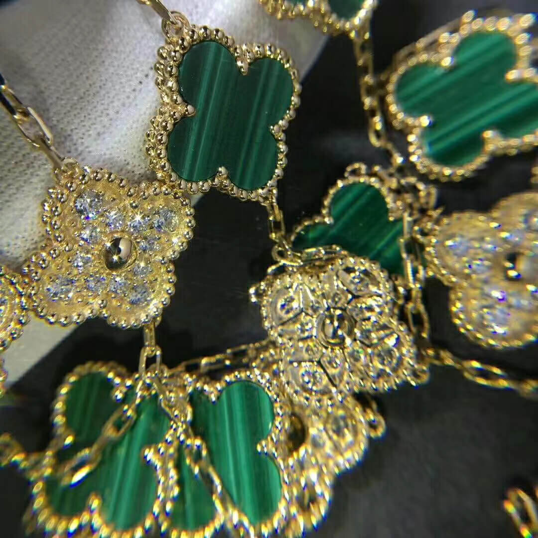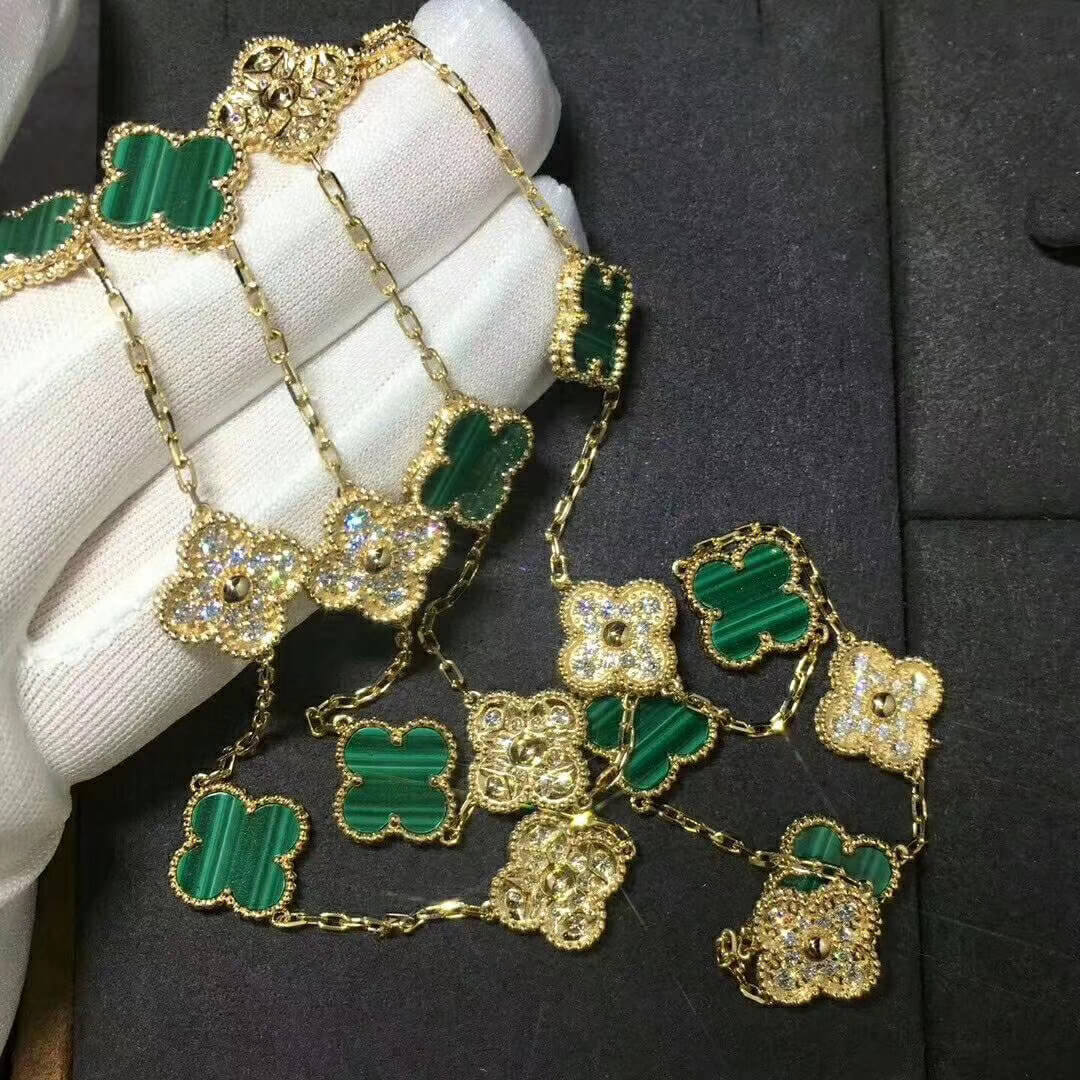 Vintage Alhambra long necklace, 20 motifs, yellow gold, malachite, round diamonds; diamond quality DEF, IF to VVS.