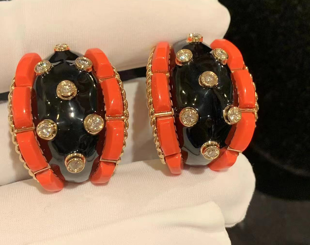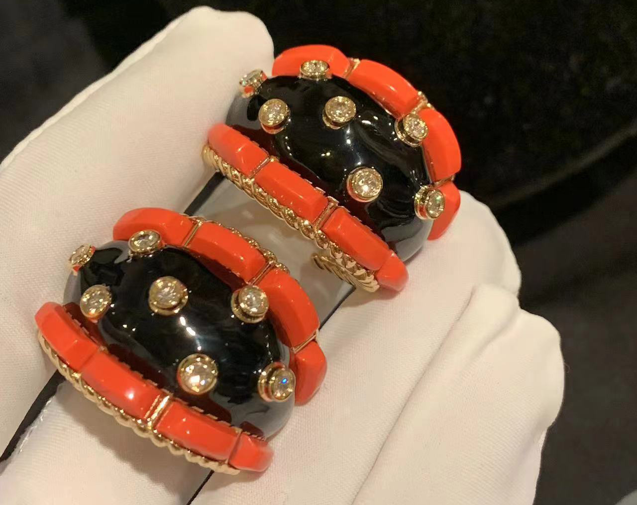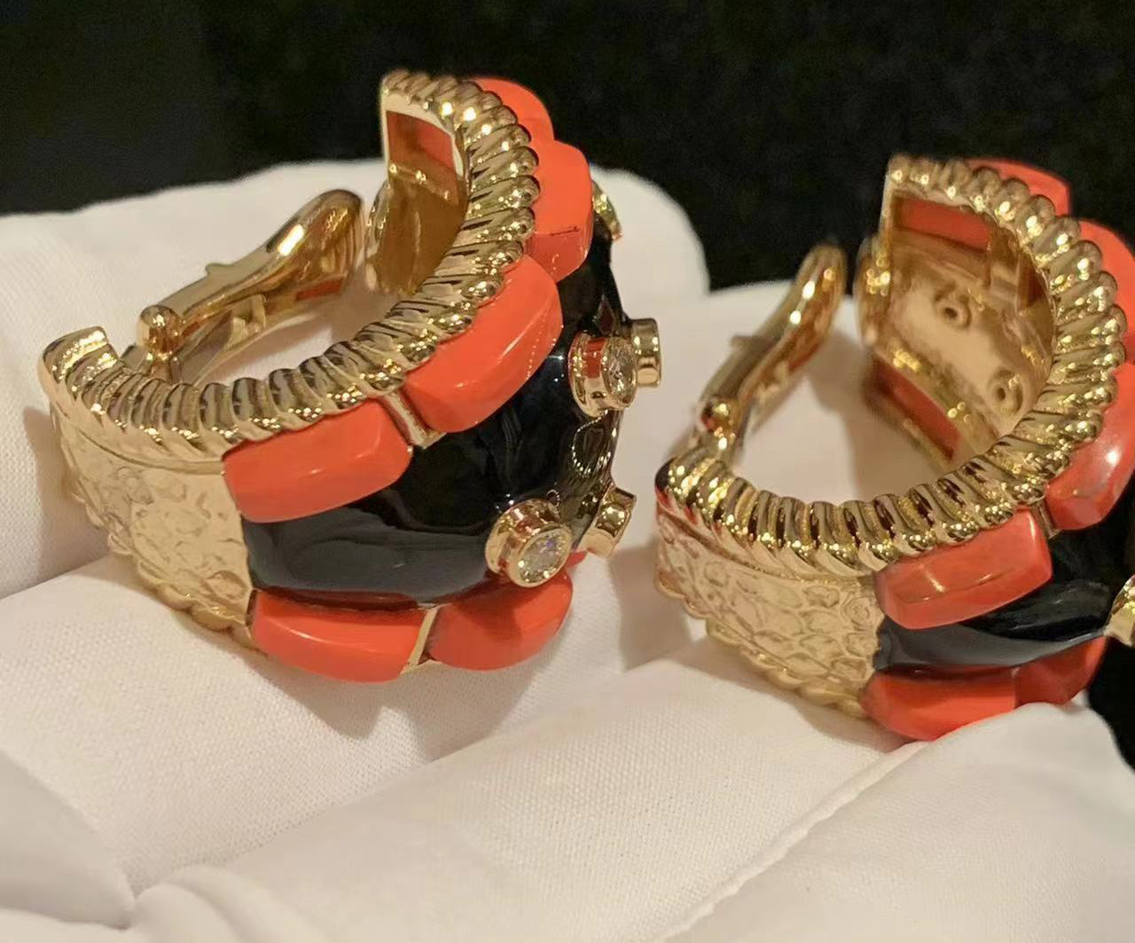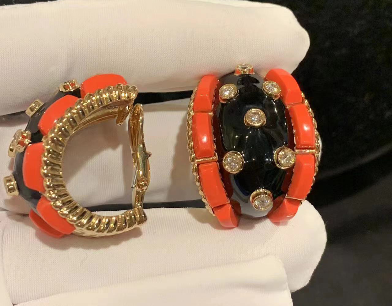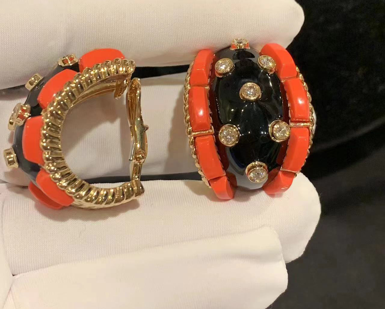 This exquisite pair of vintage 18k gold earrings by the renowned David Webb aim to elevate your jewelry collection. These oversized earrings showcase Webb’s iconic design aesthetic, featuring a striking combination of black enamel, vibrant coral, and shimmering round diamonds. Their bold and unique design makes them the perfect companion to the Bastille ring, also from David Webb’s collection.