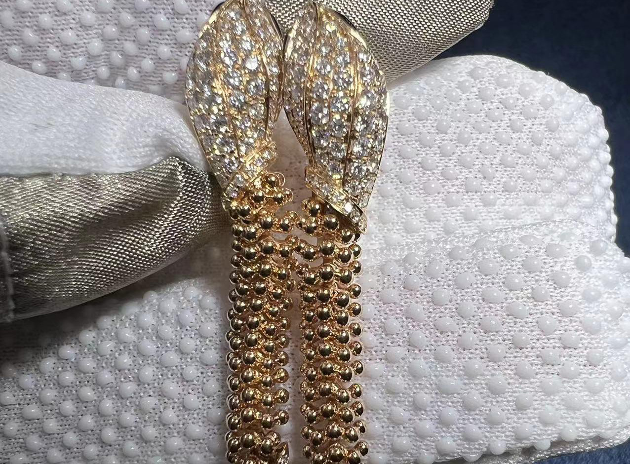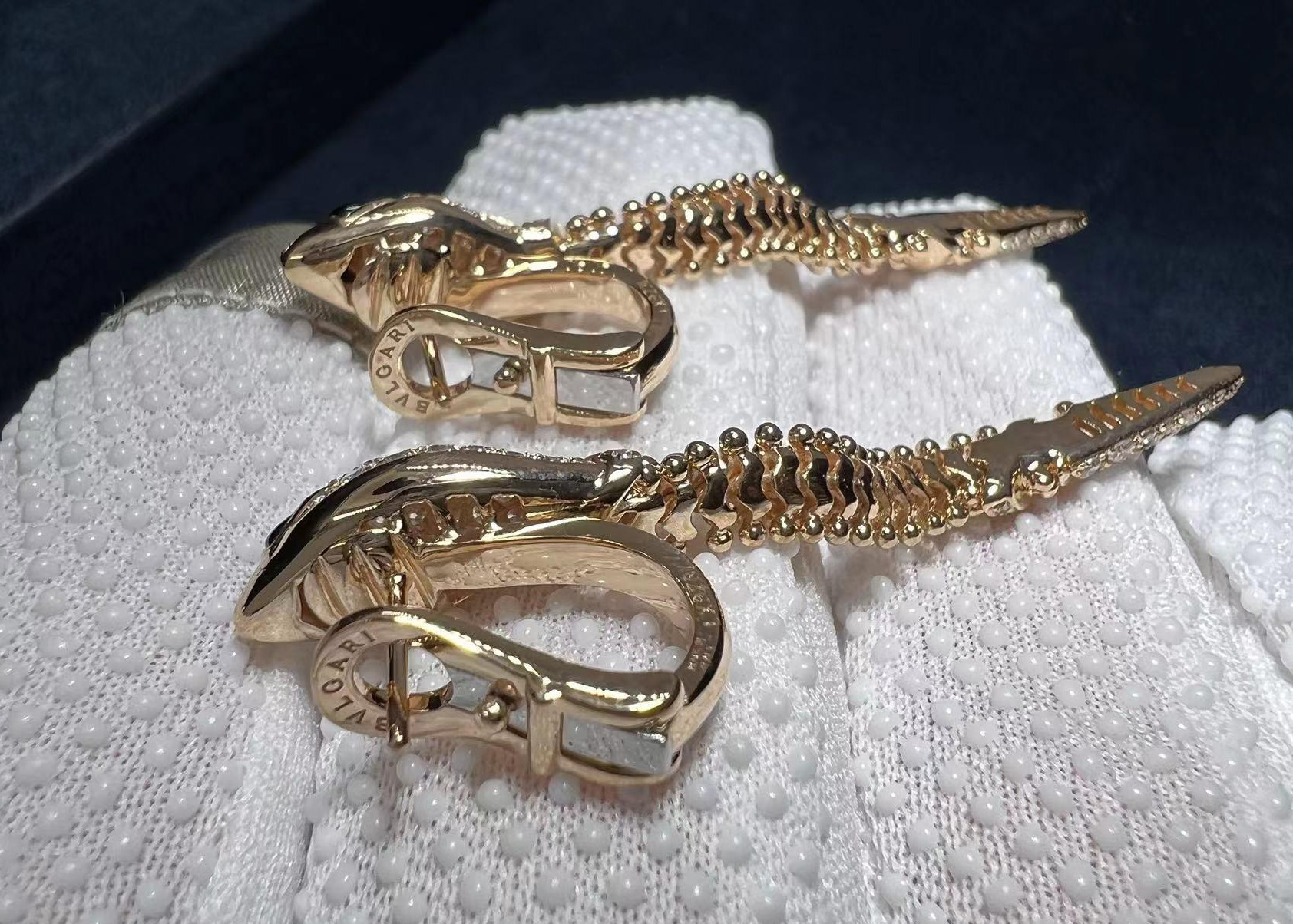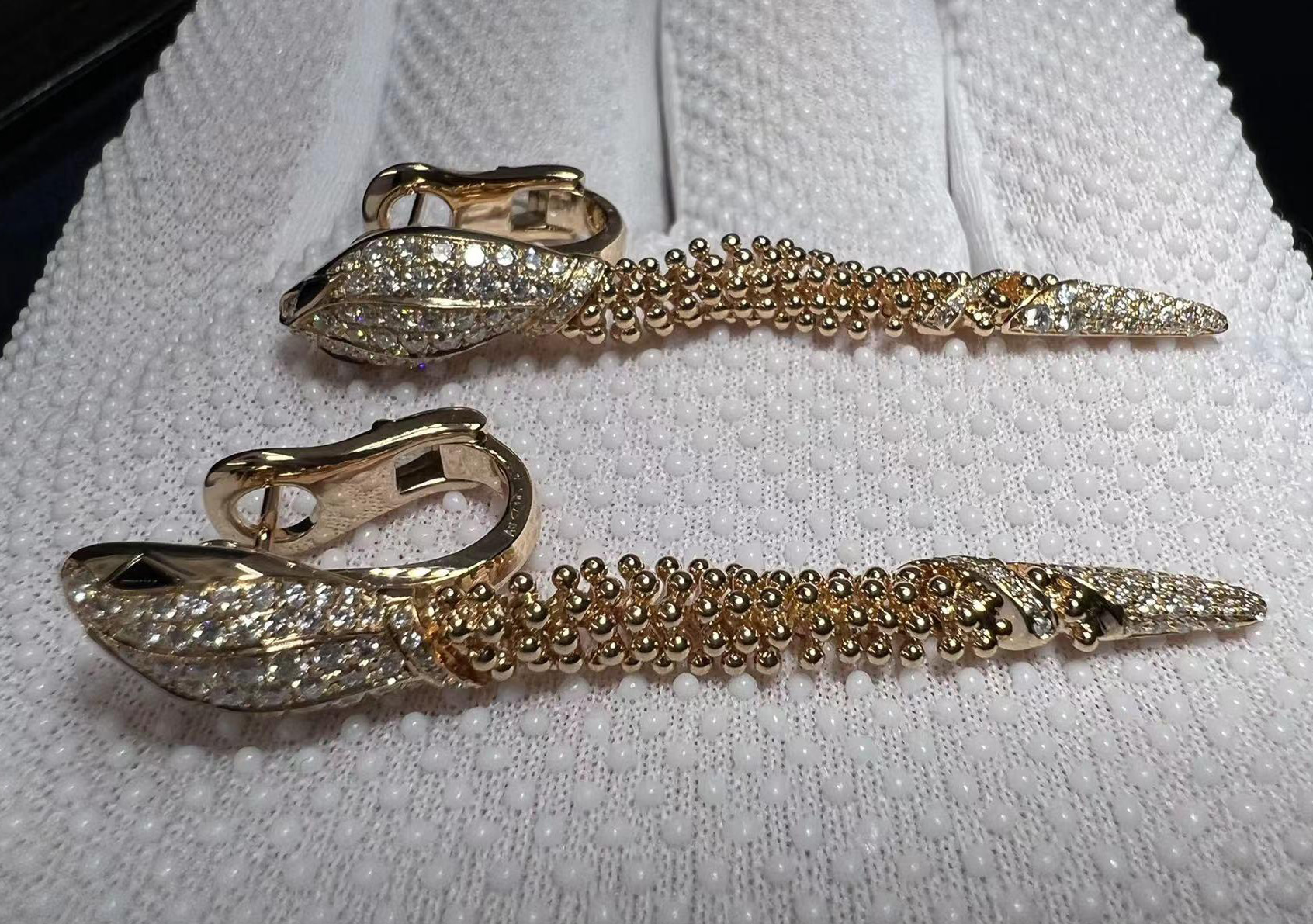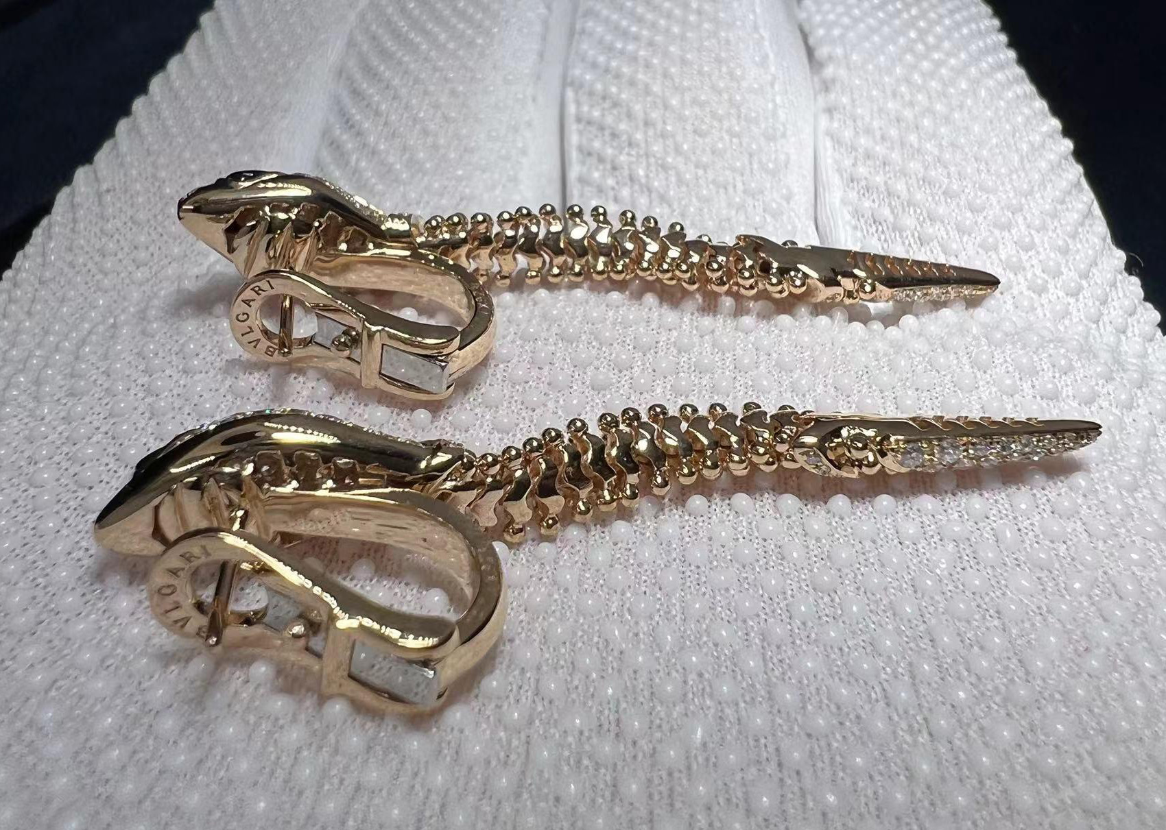 This 18k Rose Gold Bvlgari Serpenti Earrings Pave Diamonds and Black Onyx Eyes is a distinctive interpretation of Bulgari’s icon of endless metamorphosis and unstoppable transformation. The Serpenti 18 kt rose gold earrings represents a captivating blend between audacious craftsmanship, iconic design and boundless creativity.The snake’s precious body is artfully made of mobile small gold beads adding movement and tactile appeal to the jewellery piece, while its mesmerising head and sinuous tail are elegantly set with pavé diamonds.