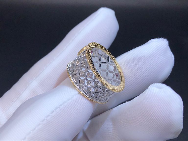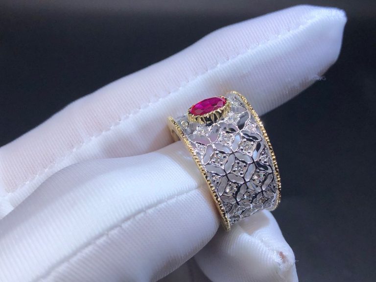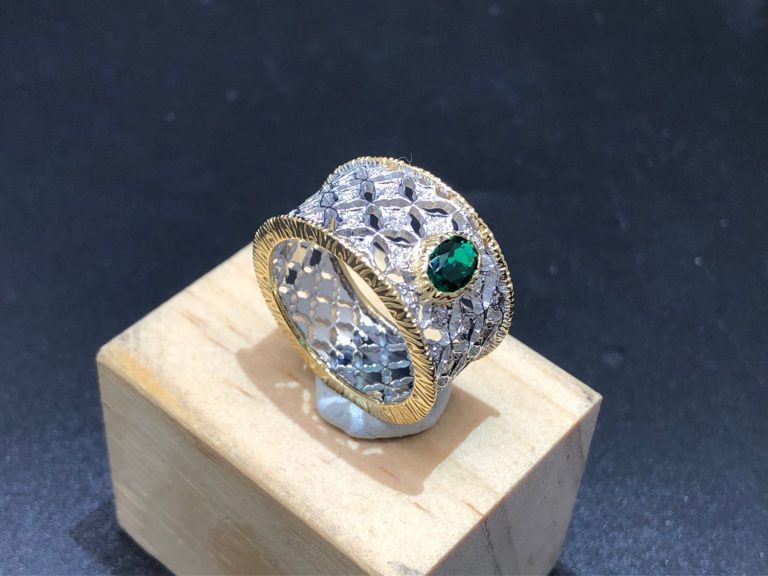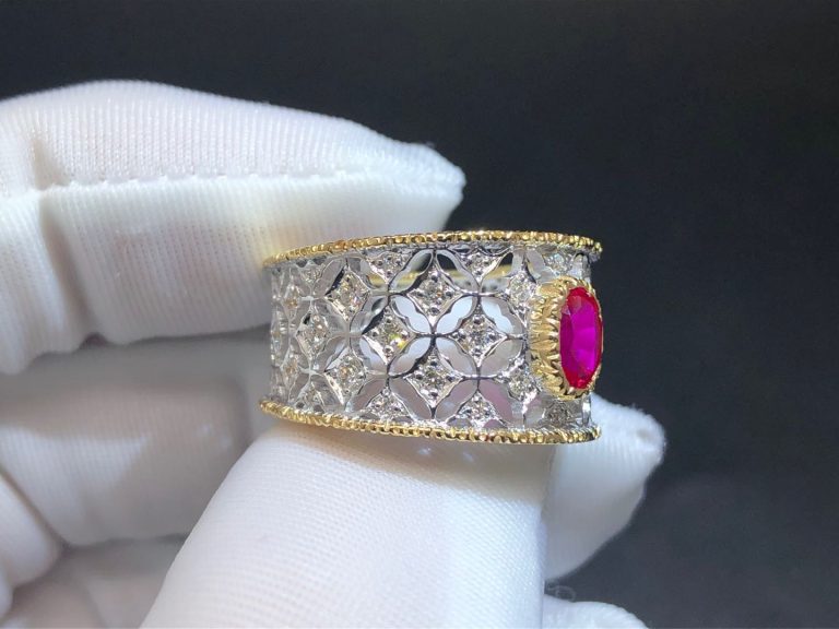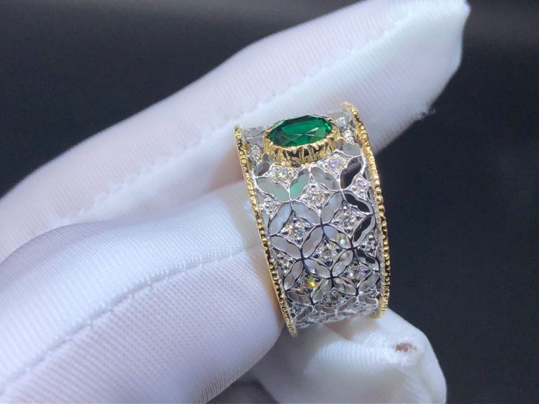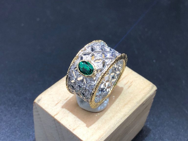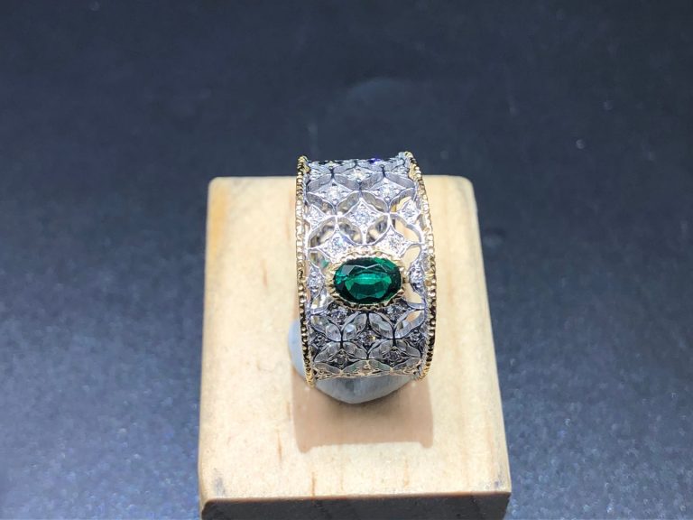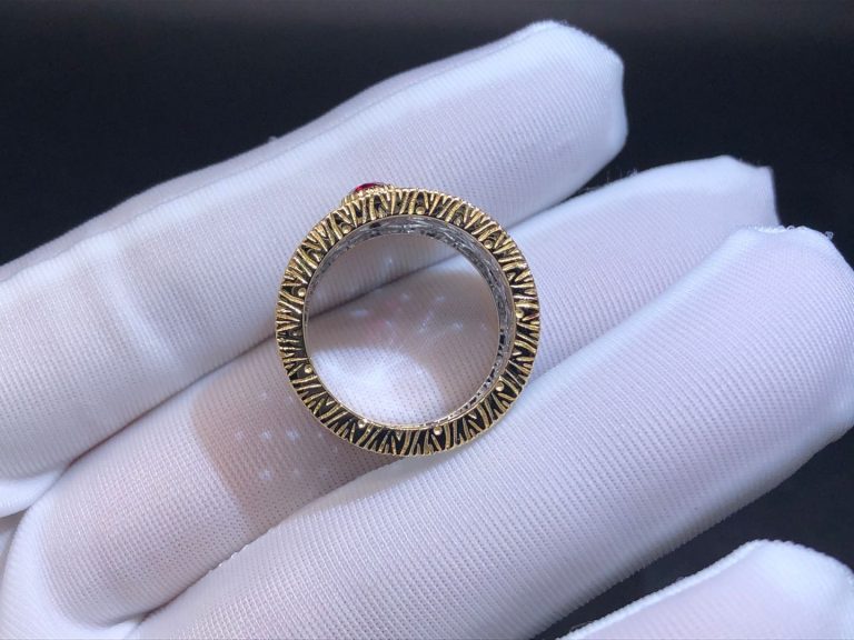 These two Mario buccellati Ruby And Emerald Band Rings are made of Two-Color Gold, the main stone are a ruby and a emerald and set with diamonds.