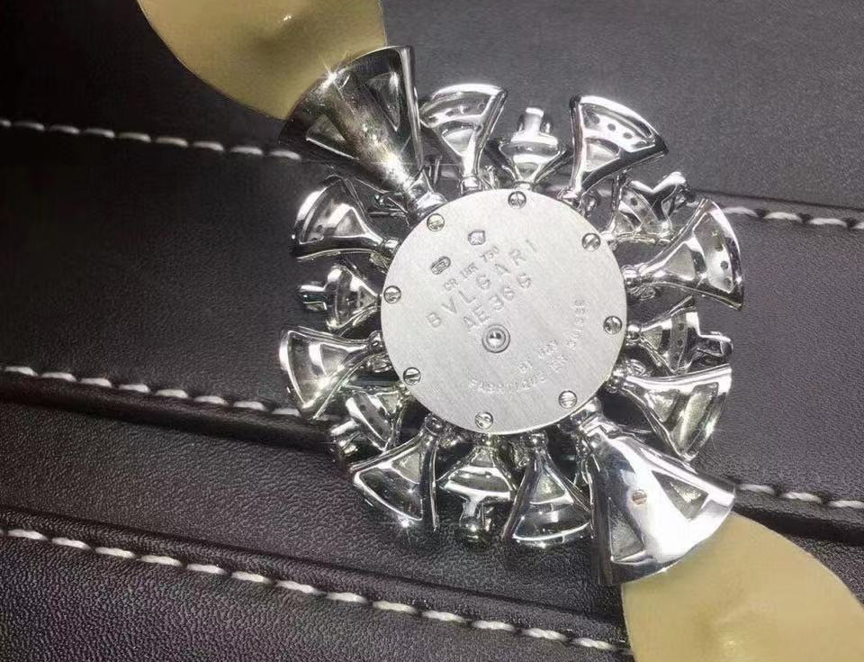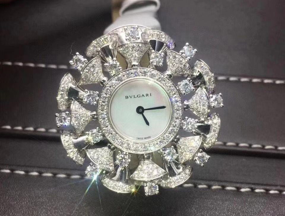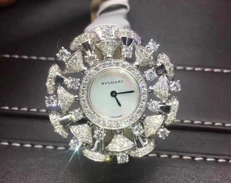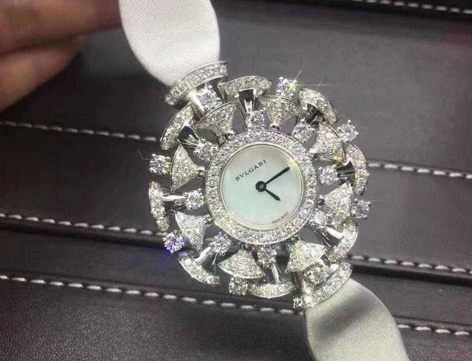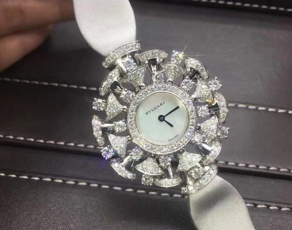 This Bulgari Divas’ Dream Watch For Ladies frames the radiance of a gleaming dial with the delicacy of the iconic fan-shaped motif, the DIVAS’ DREAM timepiece reveals the multifaceted shades of contemporary women. Inspired by feminine elegance and by the enchanting allure of the eternal city, the DIVAS’ DREAM timepiece pays homage to the most glamorous divas with an unmistakable Roman spirit. Quintessentially feminine and refined, the jewelry watch is sculpted capturing the charm of the Caracalla Baths marble and the sensual curves of its fan-shaped mosaics, reflecting the very essence of Italian beauty.
