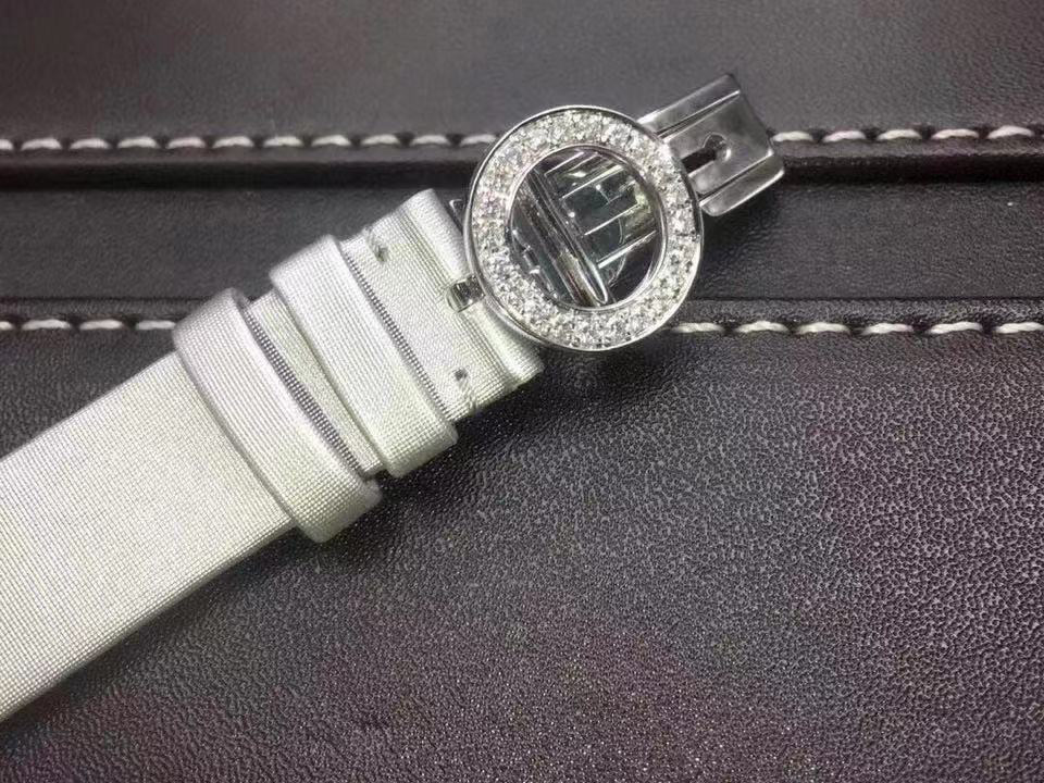 DIVAS’ DREAM watch with quartz movement, 39mm diameter 18 kt white gold case set with brilliant and round-cut diamonds, white mother-of-pearl dial, grey satin strap and 18 kt white gold buckle set with brilliant-cut diamonds.