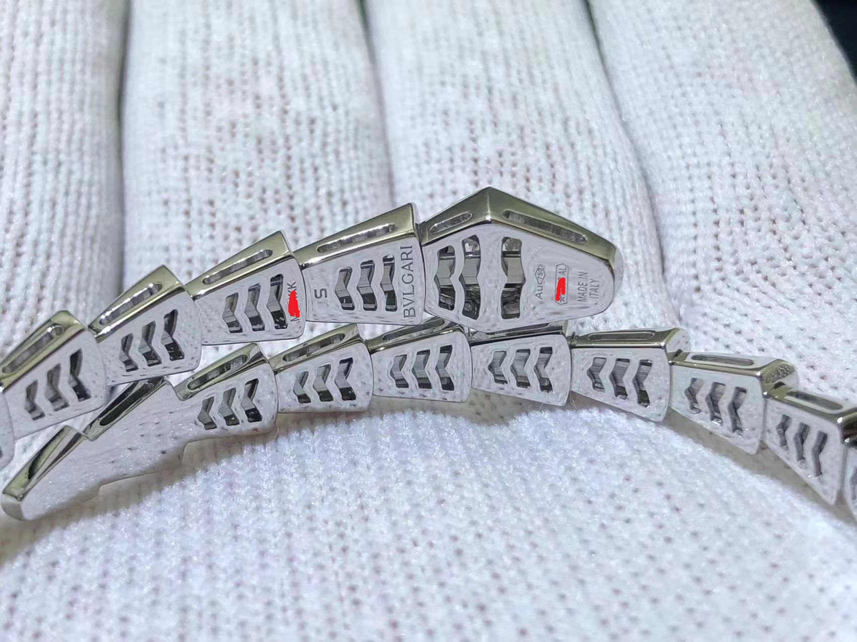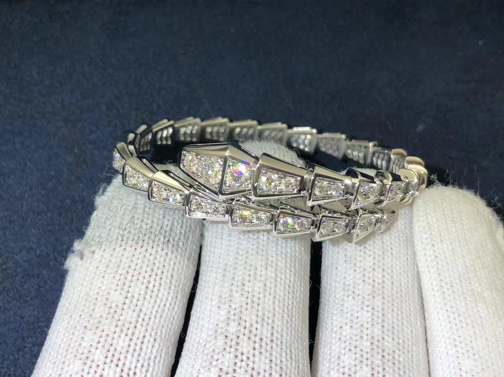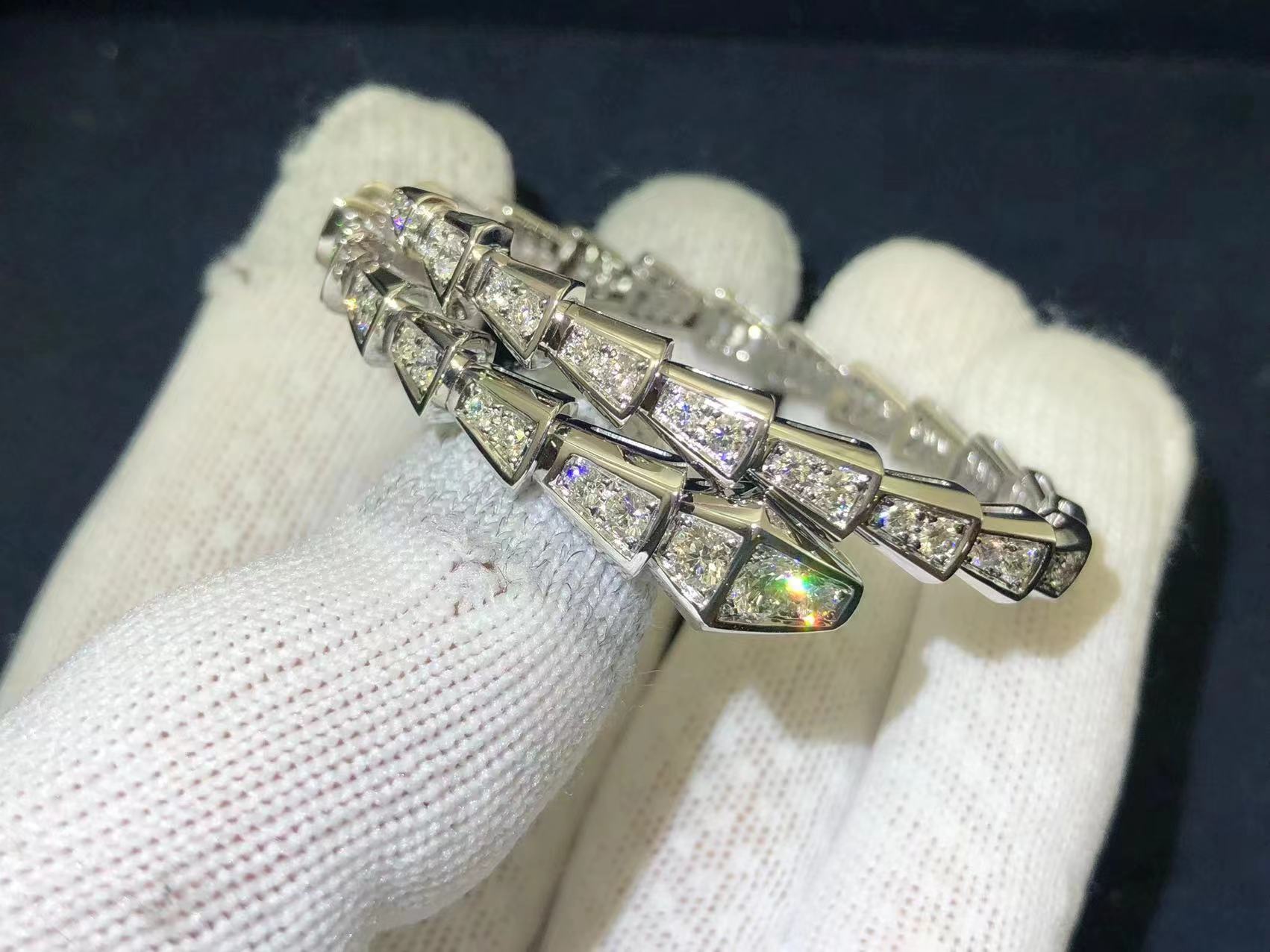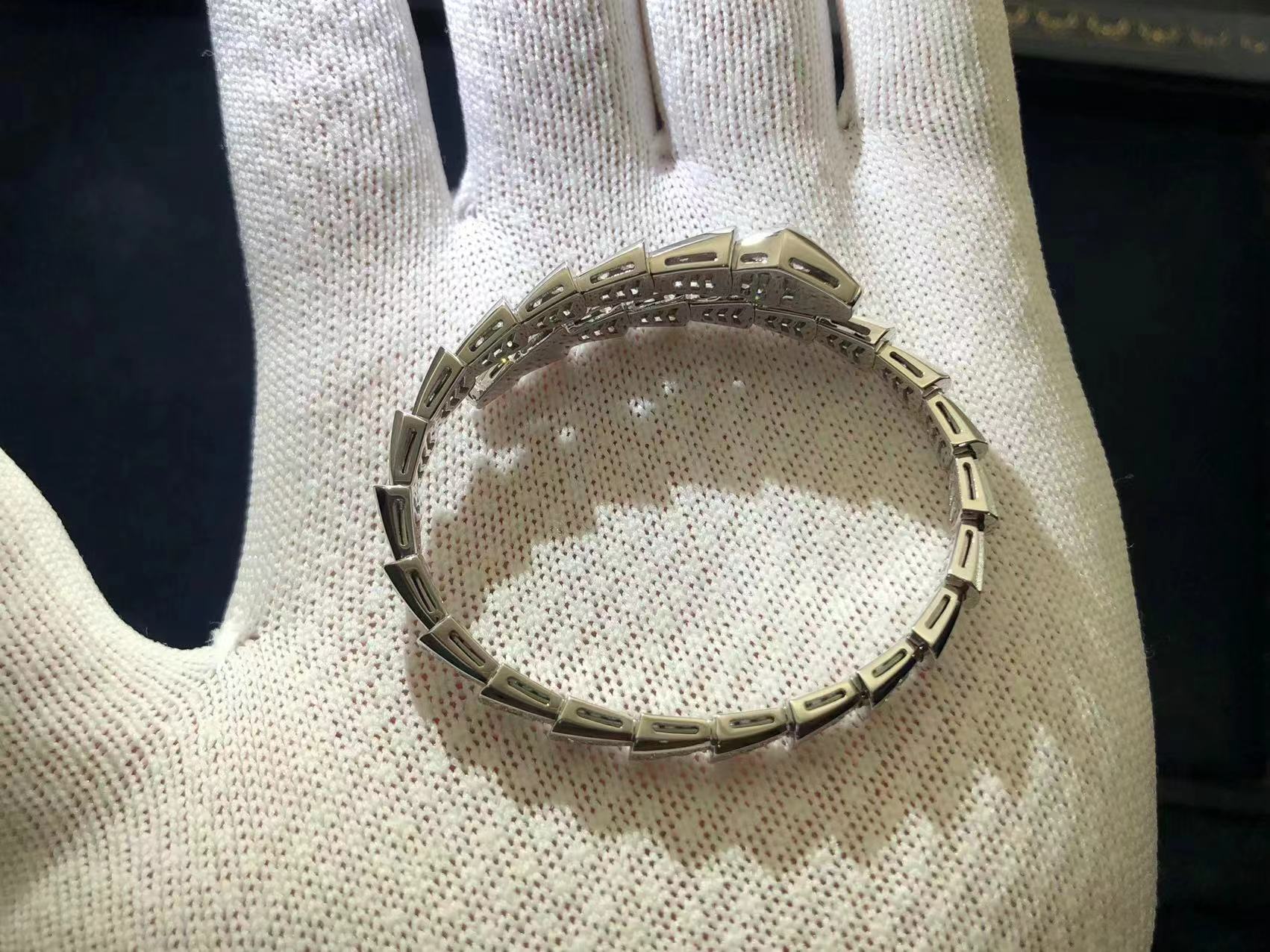 Thi spendid bracelet is from the Serpenti Viper Collection. In a tribute to its spirit animal, Bulgari captures the power of seduction in this Serpenti Viper bracelet, camouflaging sensuality and temptation with a hypnotic design. Sophisticated and glamorous, this jewel coils around the wrist and stands out for the precious beauty of the scales and the distinctive sinuosity of the snake. Cast in lustrous 18K white gold inset with sparkling 3.28ct round diamonds.