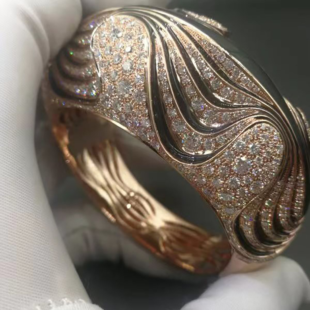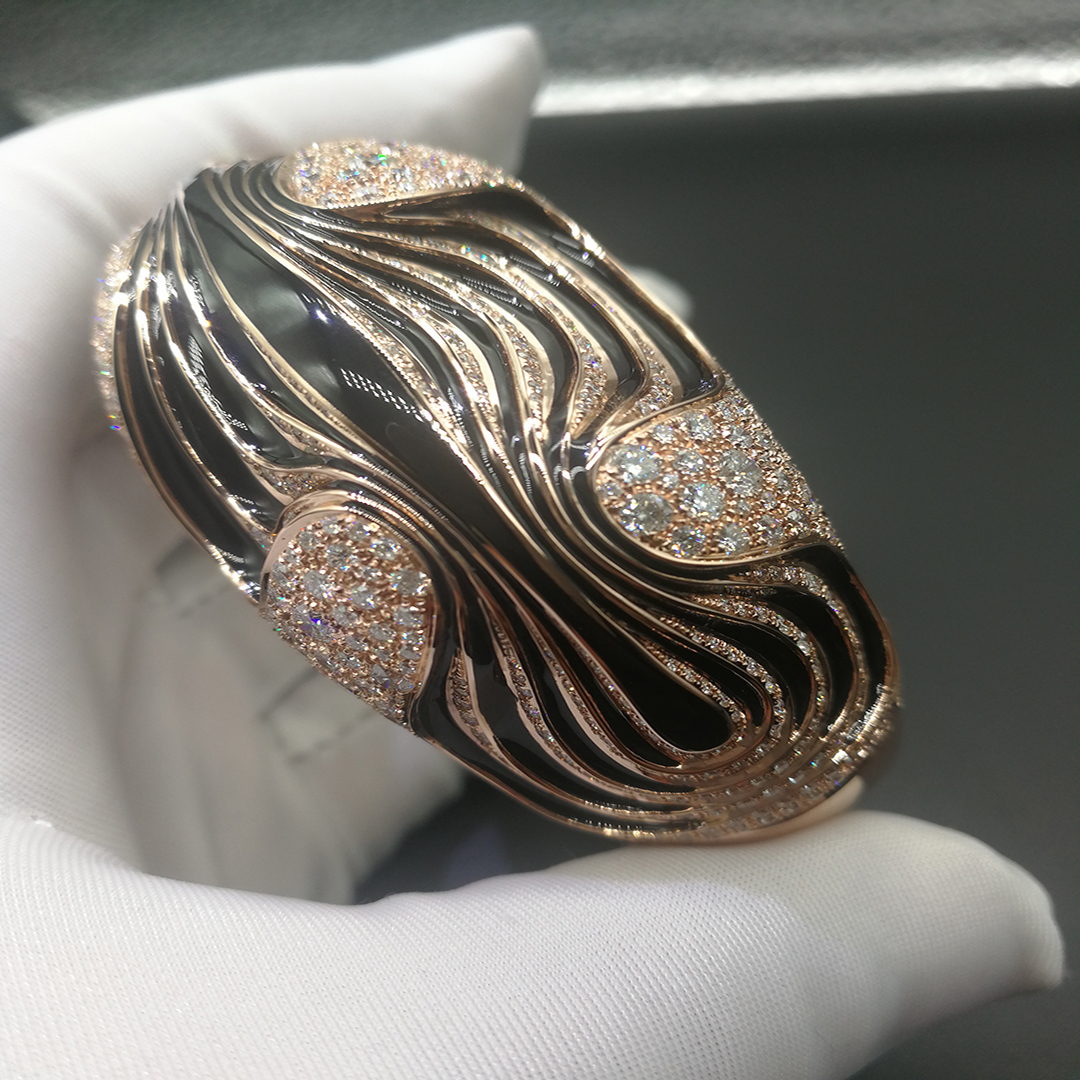 The contoured patterns of water on sand are exquisitely recreated by Cartier in this gold, lacquer and diamond bracelet.
