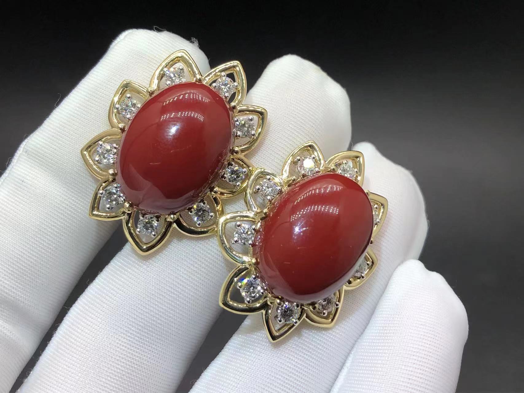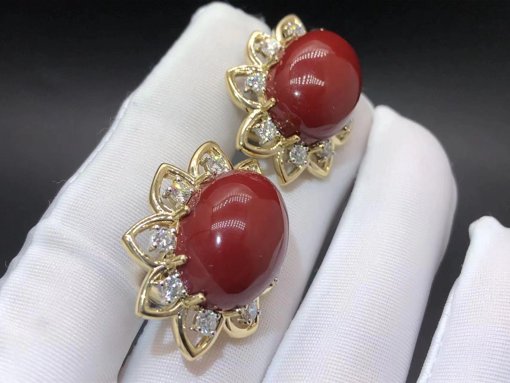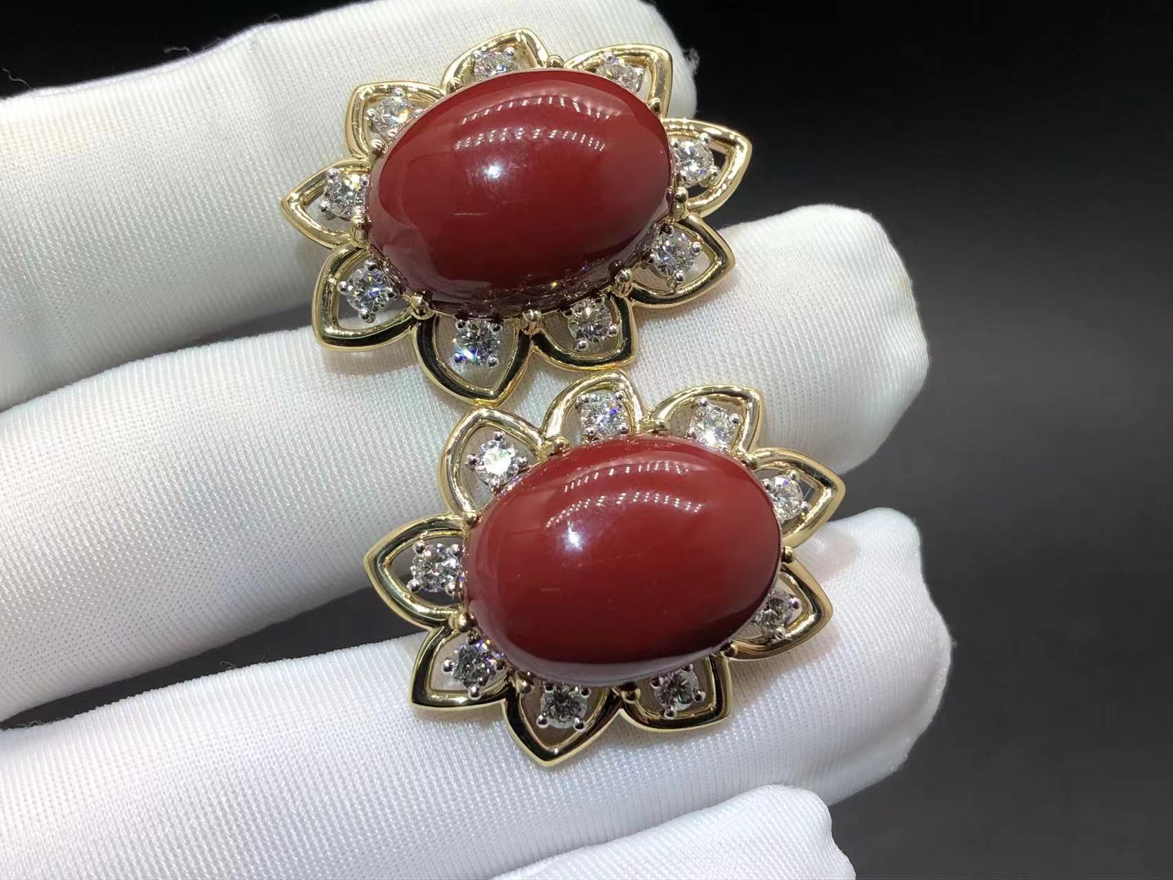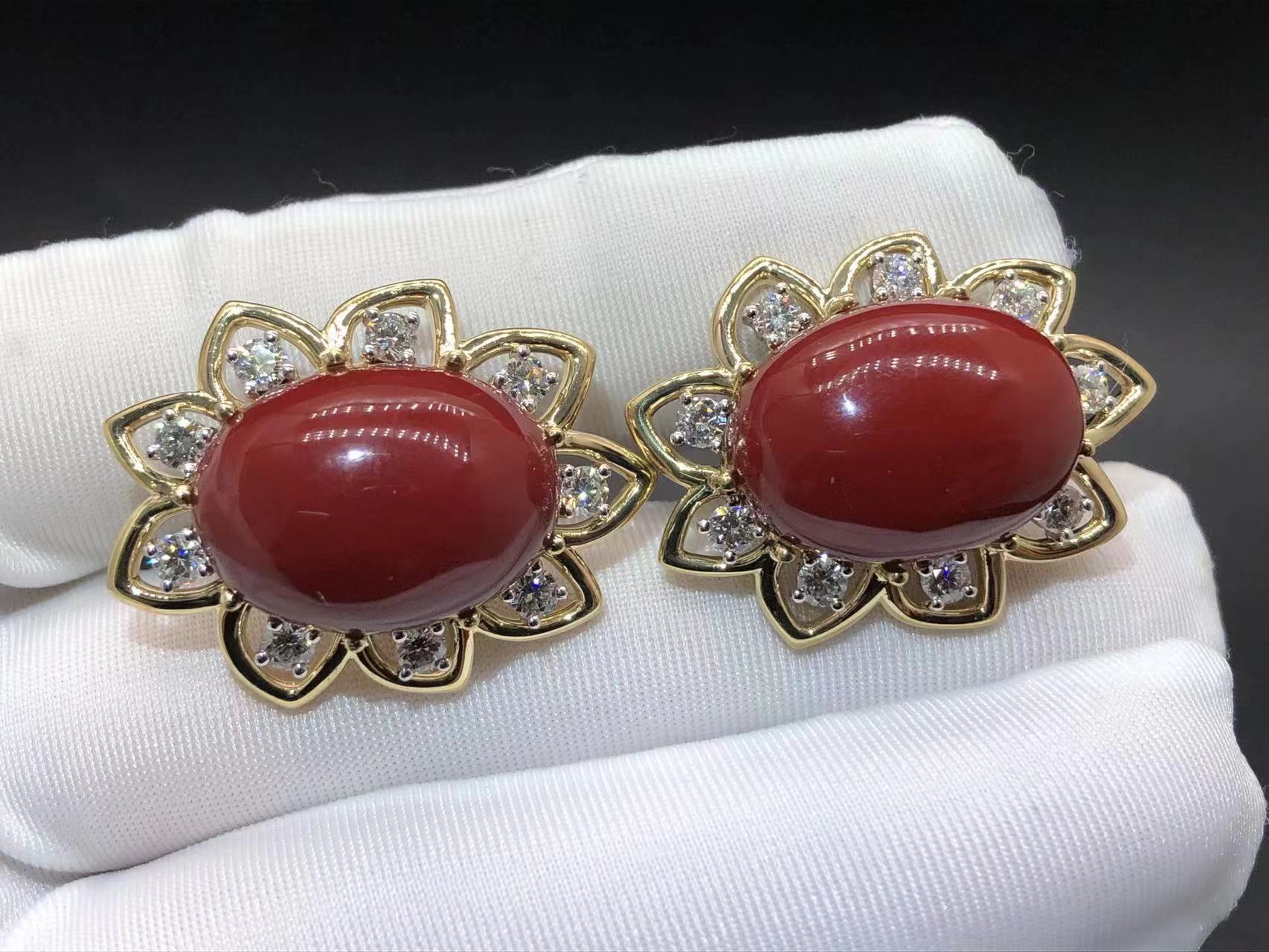 Inspired David Webb Red Coral Diamond Flowers Earrings in 18k Yellow Gold
