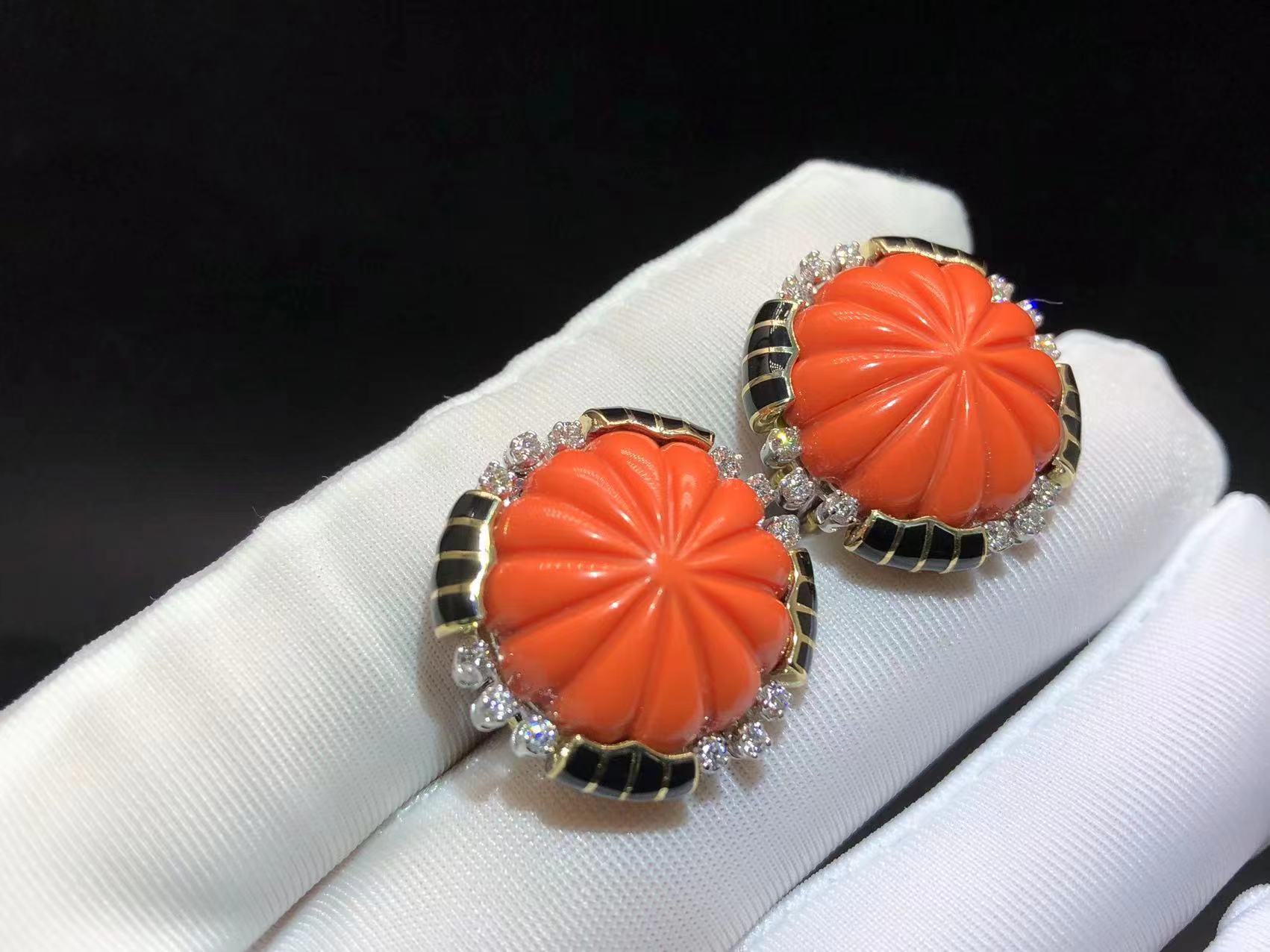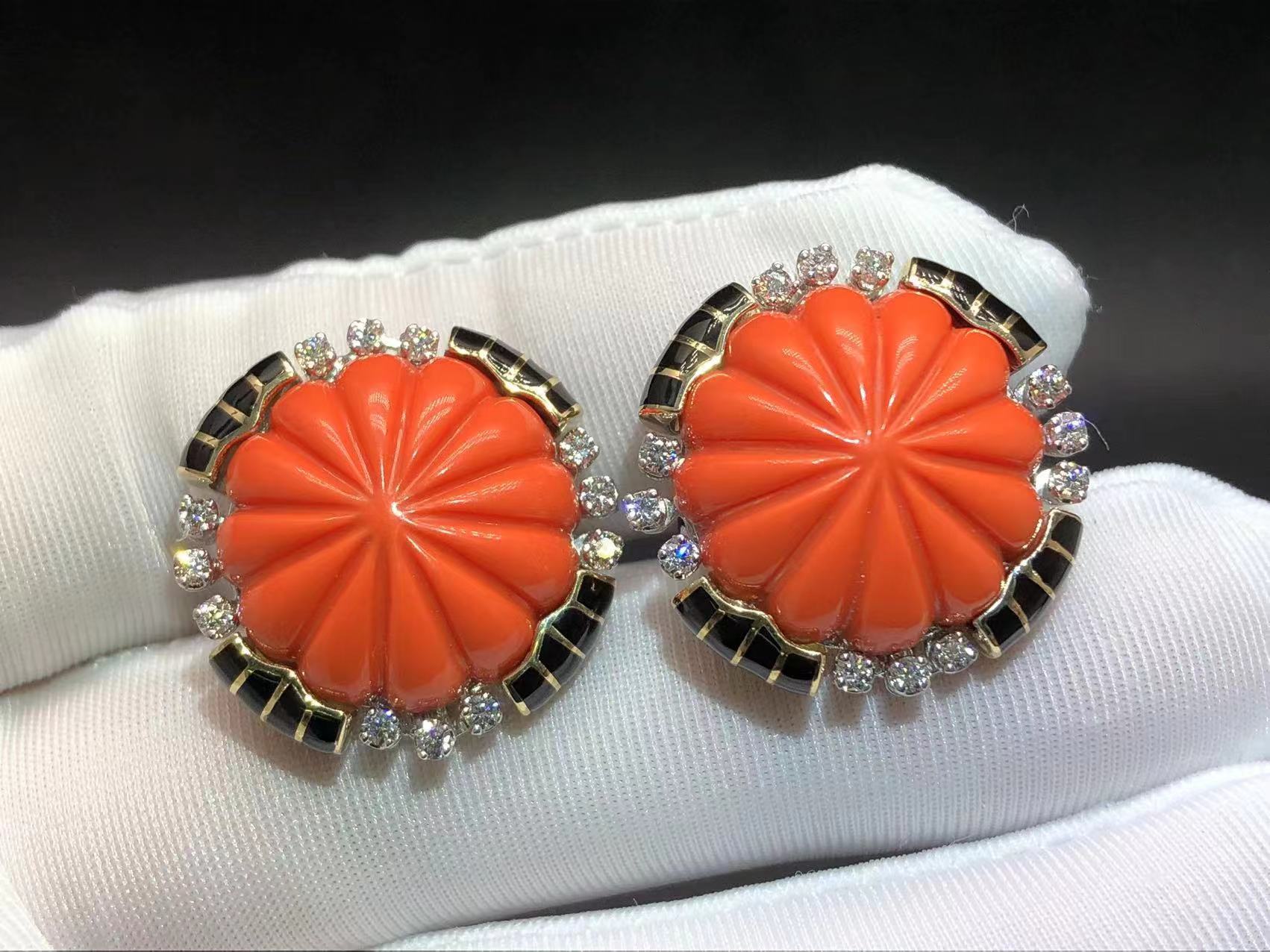 A pair of contemporary 18 karat gold and platinum earrings with diamonds and carved corals by David Webb. Each earring centers one fluted carved coral surrounded by round brilliant-cut diamonds with an approximate total weight of 0.30 carats, accented by a touch of black enameling. Backing: Pierced post with omega back.