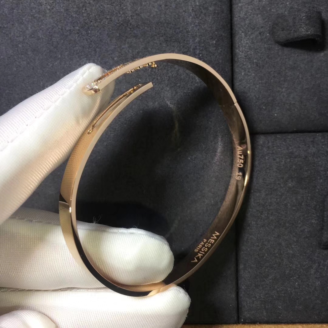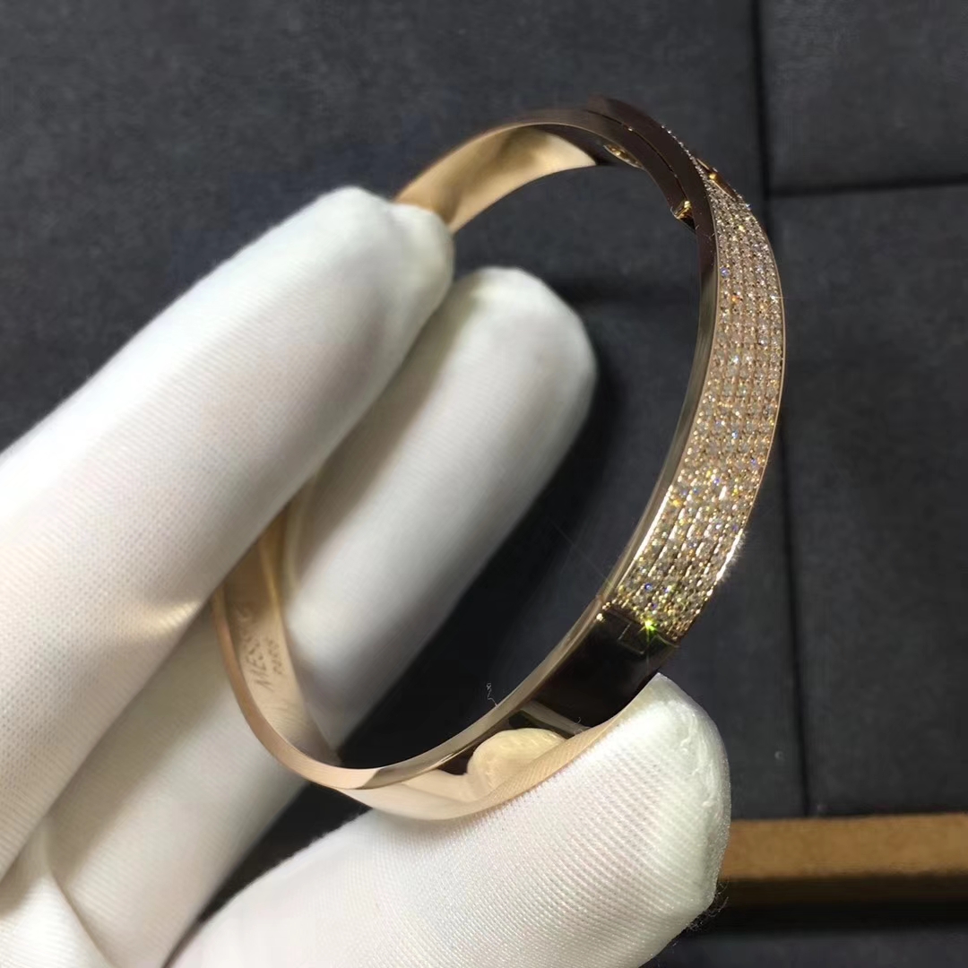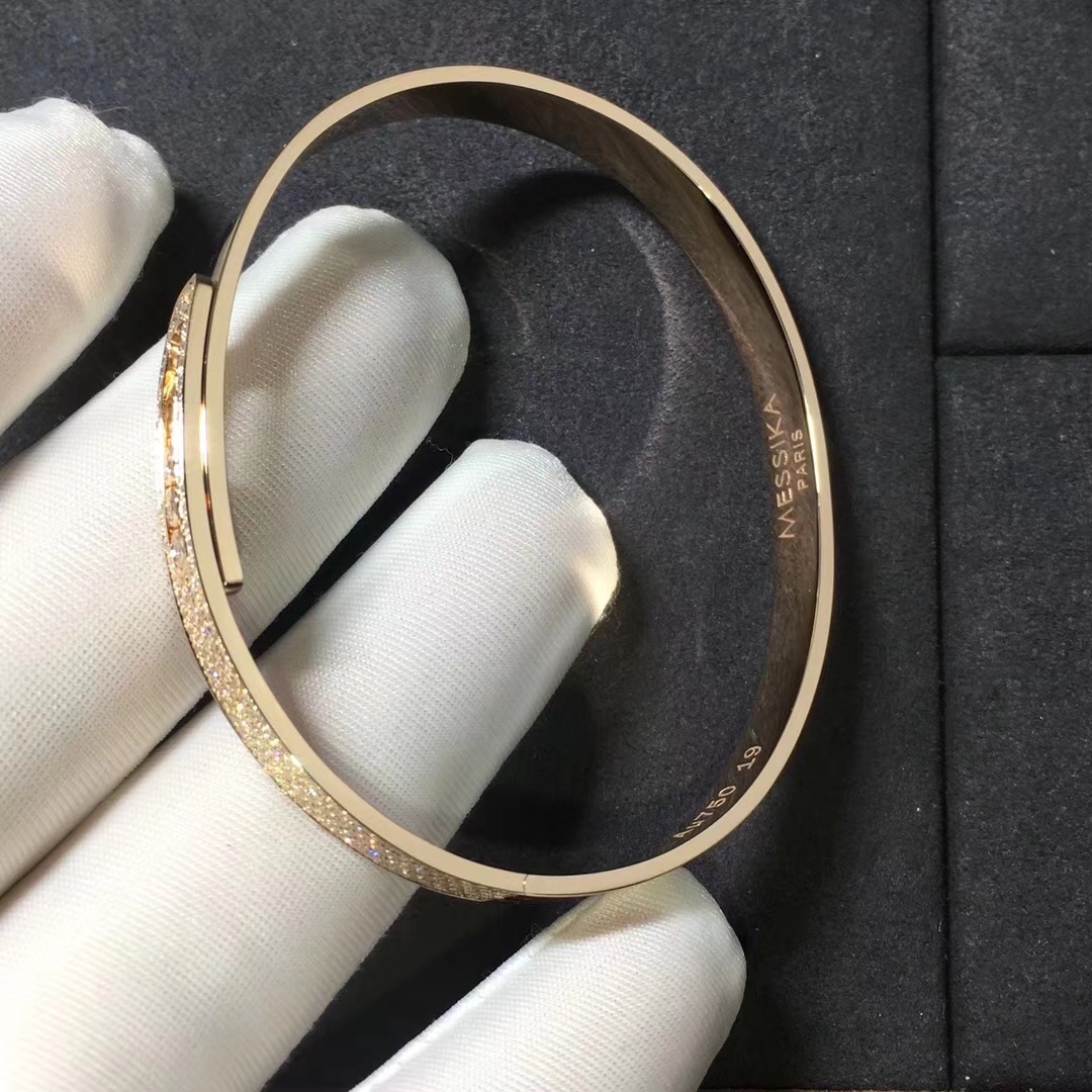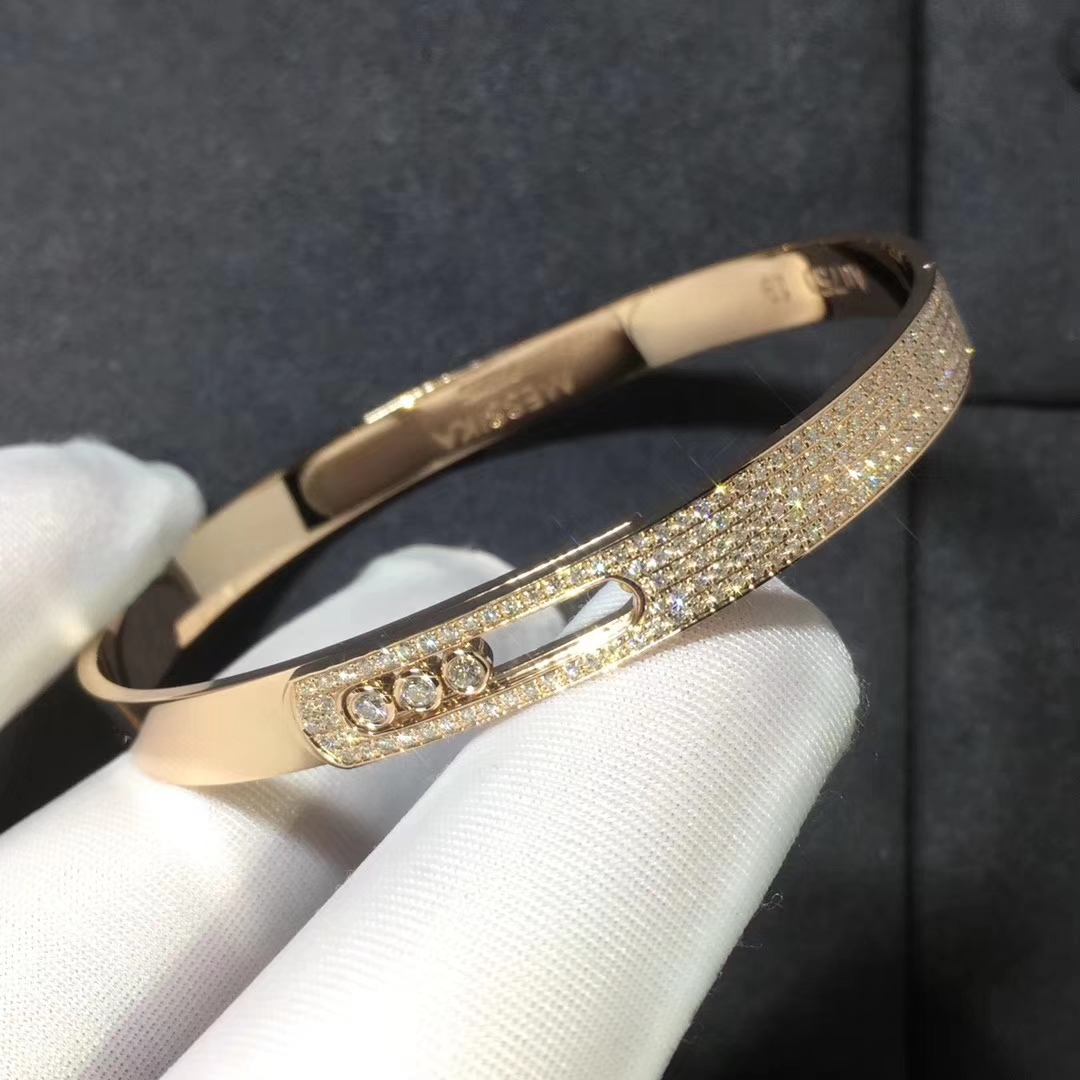 Inspired Messika Move Noa Pave 18K Rose Gold Diamond Bangle, in this pavé version, this bangle bracelet, fully handcrafted and set with three brilliant cut diamonds, is a piece of Move, the signature line of Messika House. In 18K rosy gold, its luminous and original color will win over women who seek for a unique jewel. Like a gold ribbon, the Noa bracelet also called bangle or slave bracelet gently wraps the cuff. The radiance of the polished gold is balanced by a pavé blazing with light. Its timeless elegance, the three brilliant cut diamonds in motion, symbols of the love of yesterday, today and tomorrow make this bangle the everyday companion of a chic look as well as a casual one. This Move Noa bangle can be worn alone or stacked with more bangle bracelets.