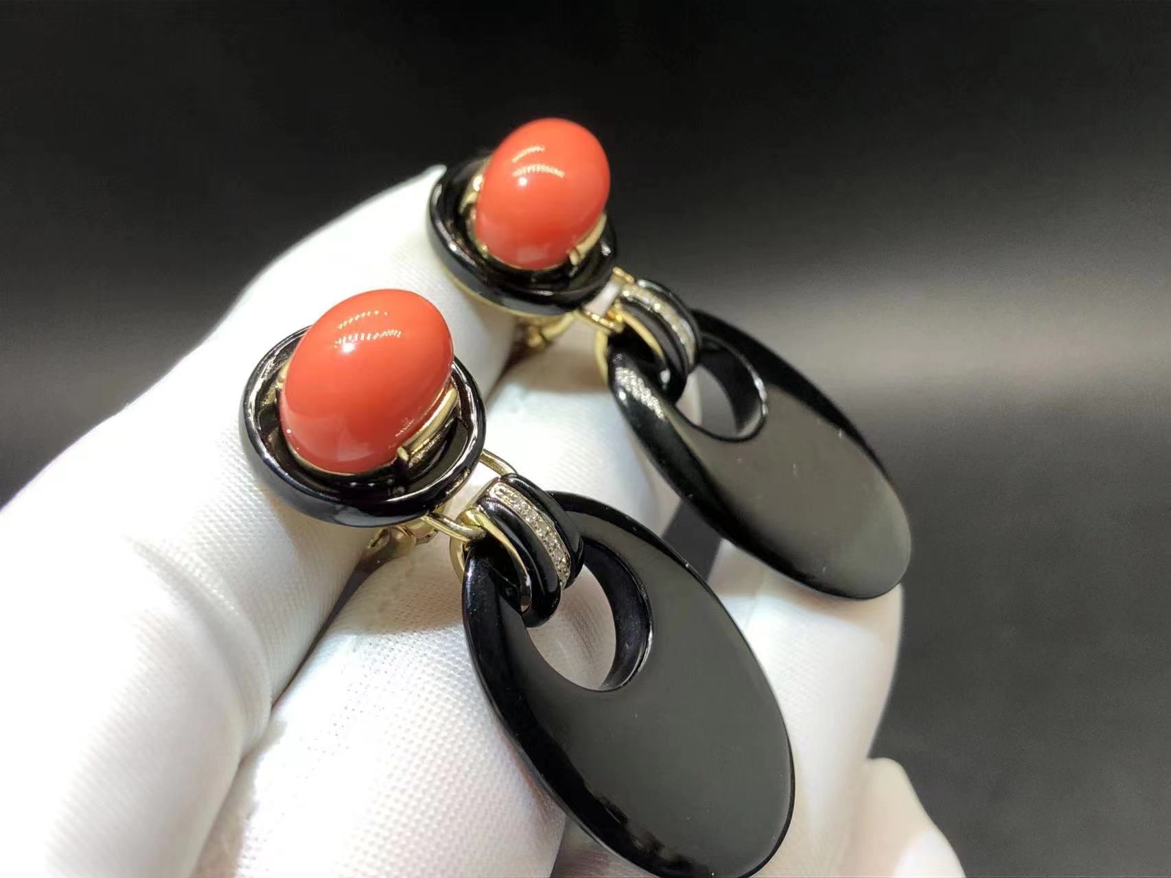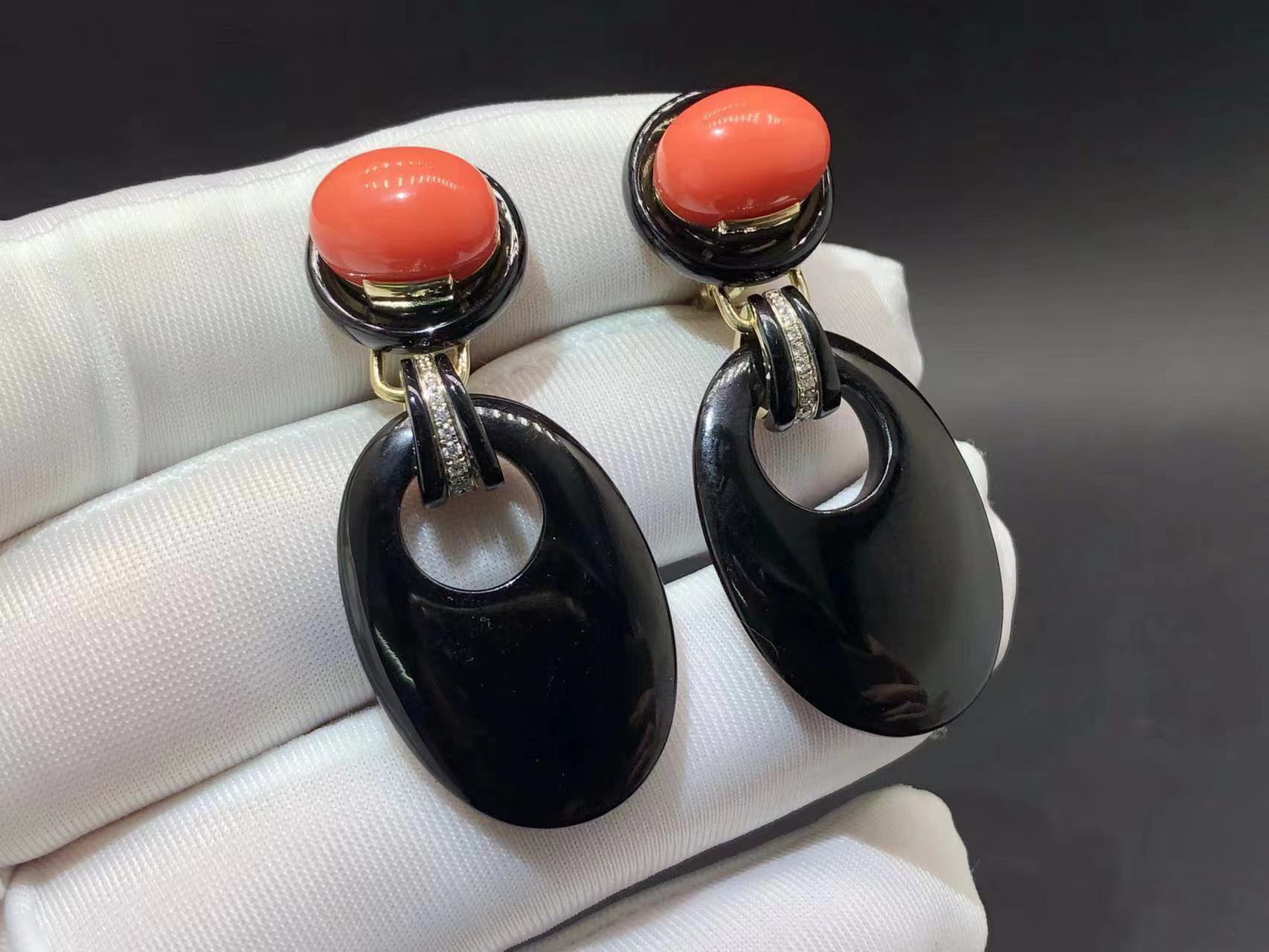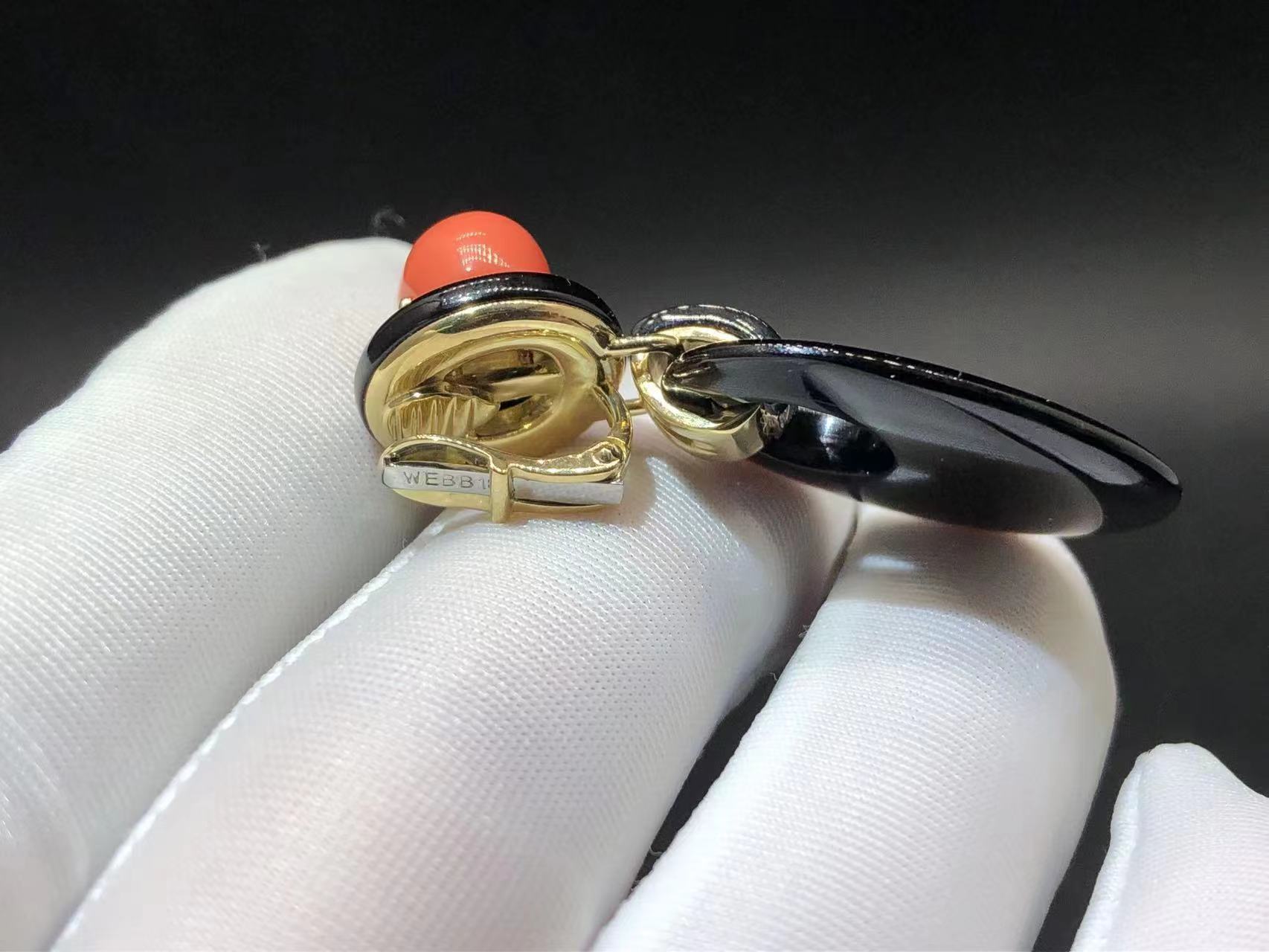 The expression of David Webb Colorful, dramatic designs with playful attitude. This pair of A true experimenter, Webb “get along” such seemingly incompatible materials as shells, rock crystal, coral and … Gold and platinum. This pair of David Webb 18k Yellow Gold Onyx and Coral Drop Door Knocker Earrings are the masterpieces of this company’s icionc