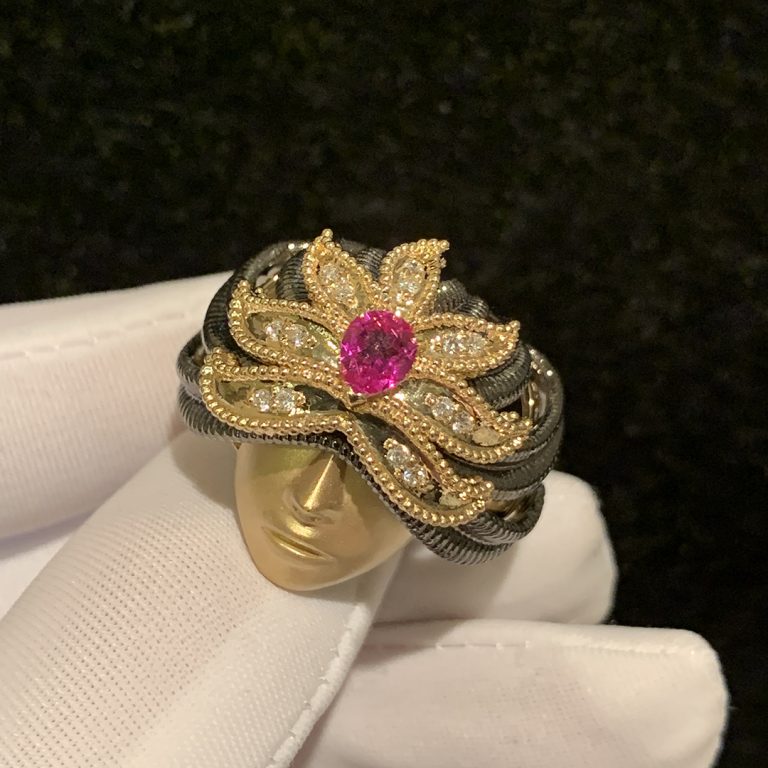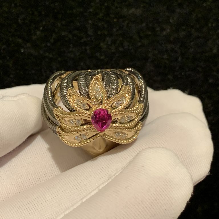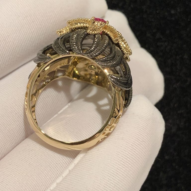 This bespoke Buccellati 18K Yellow & Black Gold Diamond and Ruby Venus Ring is stunning jewelry for your collection.