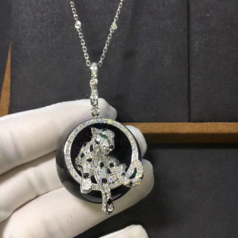 Panthère de Cartier necklace REF.: N3109300 Panthère de Cartier necklace, 18K white gold, set with black nephrite jade, 2 emerald eyes, 1 onyx nose, 22 onyx spots, and 385 brilliant-cut diamonds totaling 3.37 carats. Metal: 18k white gold Diamonds: 385 brilliant-cut diamonds totaling 3.37 carats Gemstones: black nephrite jade, emeralds, onyx Width of the motif: 28.8mm. Thickness of the motif: …