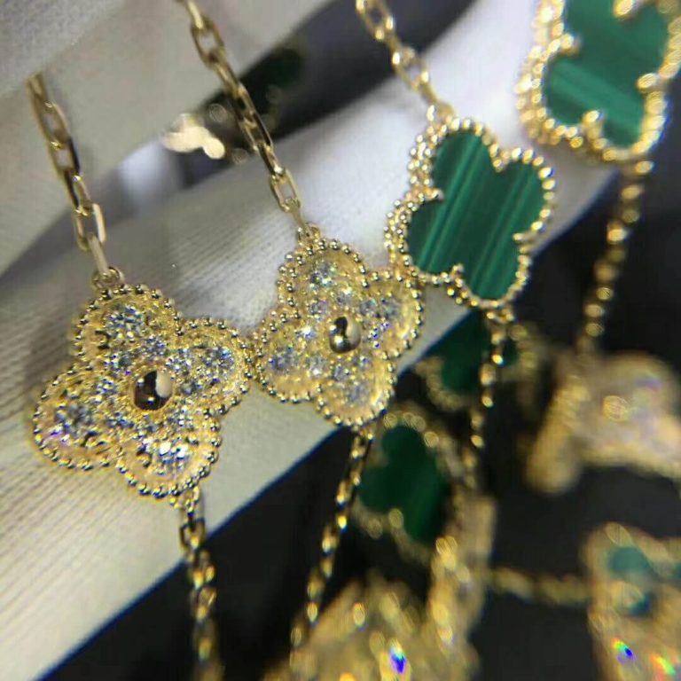 Faithful to the very first Alhambra® jewel created in 1968, the Vintage Alhambra creations by Van Cleef & Arpels are distinguished by their unique, timeless elegance. Inspired by the clover leaf, these icons of luck are adorned with a border of golden beads. Vintage Alhambra long necklace, 20 motifs, yellow gold, malachite, round diamonds; diamond quality DEF, IF to VVS. …