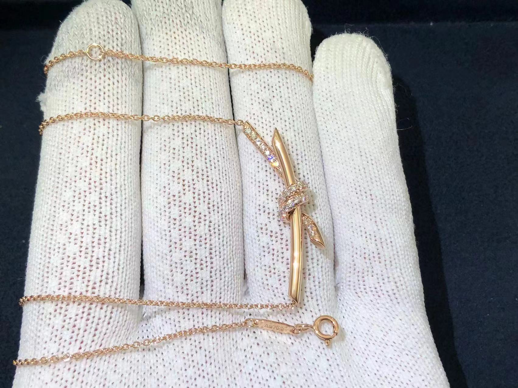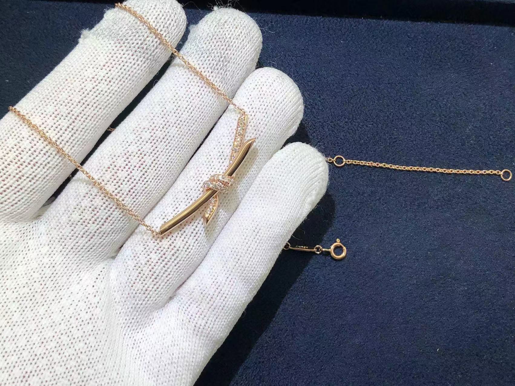 The entwined ends of Tiffany Knot’s signature motif symbolize the power of connections between people. Balancing strength and elegance, each Tiffany Knot design is a complex feat of craftsmanship. This pendant is crafted with rose gold and pavé diamonds, then polished by hand for high shine. Each round brilliant diamond—specifically chosen to meet Tiffany’s high standards—is hand set at precise angles to maximize brilliance. Wear this pendant on its own or partnered with classic silhouettes for an unexpected pairing.