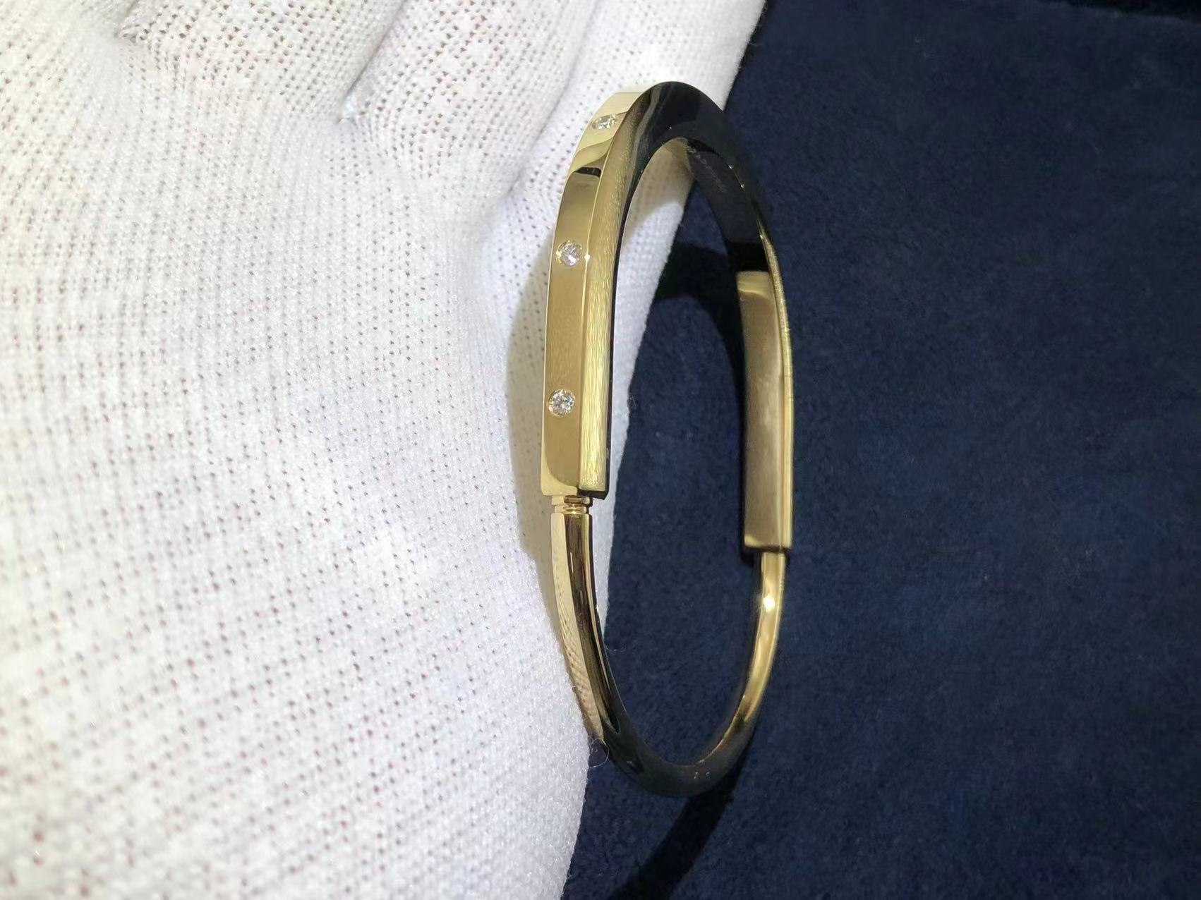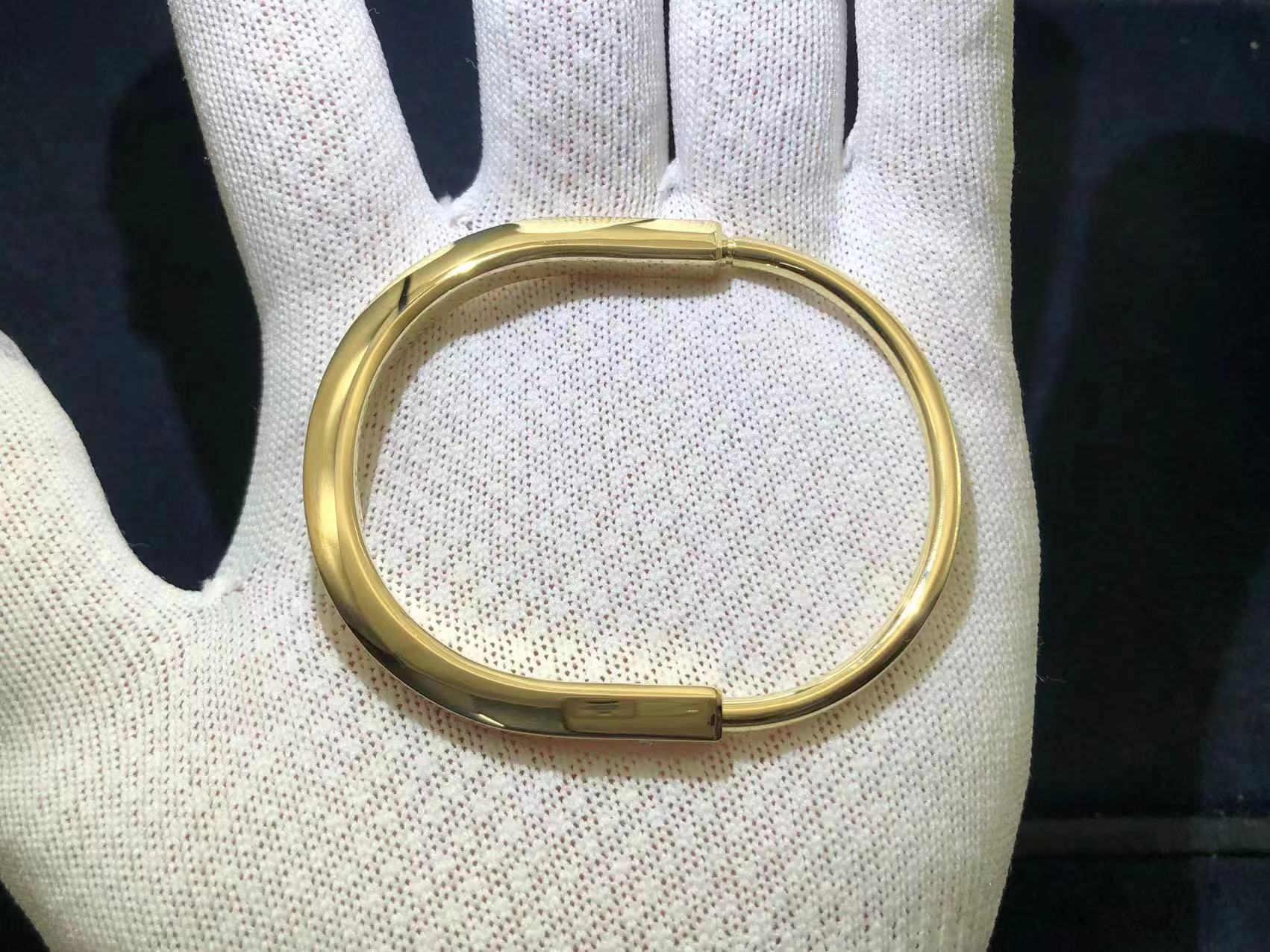 Inspired by the power of togetherness and inclusivity, Tiffany Lock is a bold and visual statement about the personal bonds that make us who we are. Designed to be worn by all genders, the Tiffany Lock bangle features an innovative clasp that echoes the functionality of a padlock, an important motif from The Tiffany Archives.This style is expertly crafted in 18k yellow gold with hand-set diamond accents for a striking contrast.