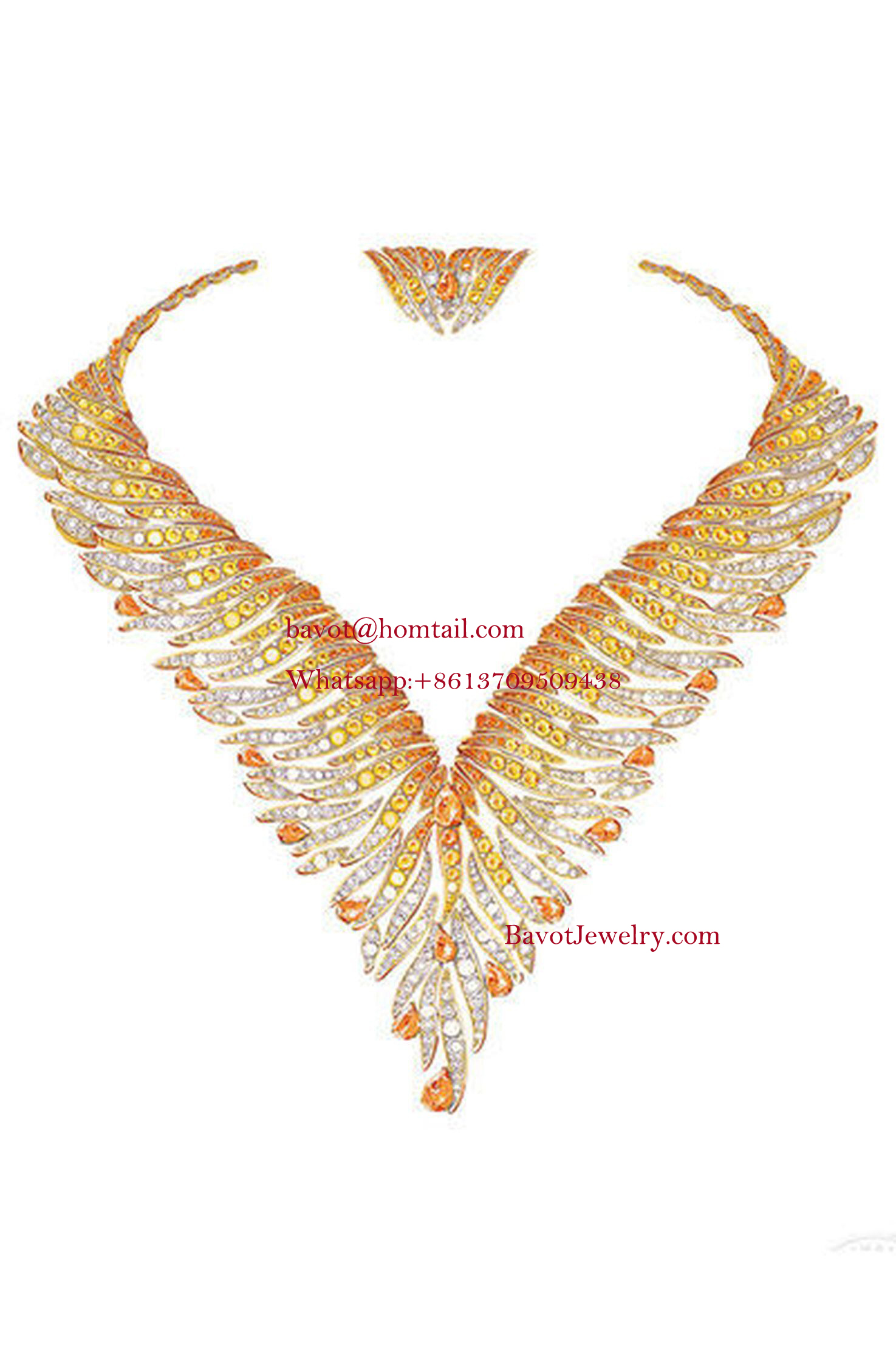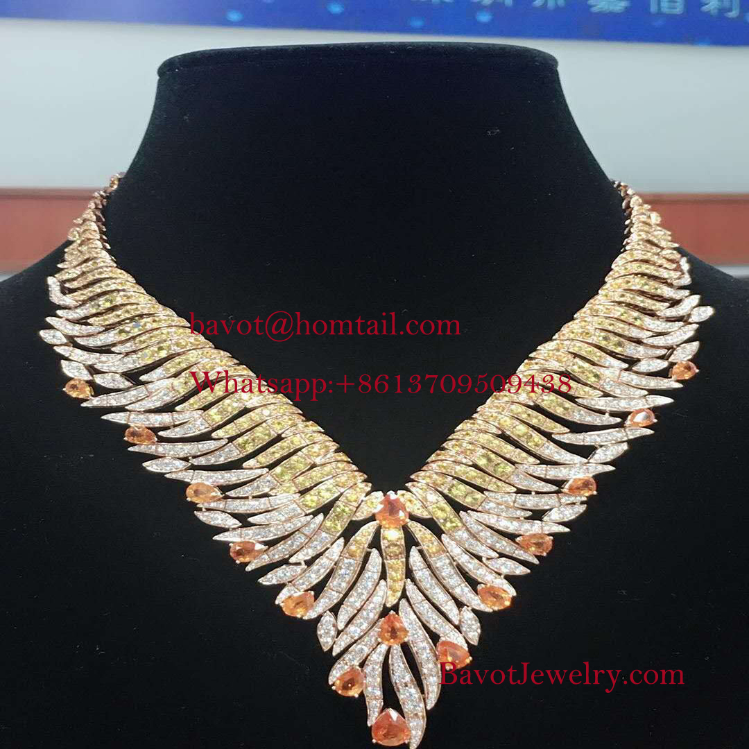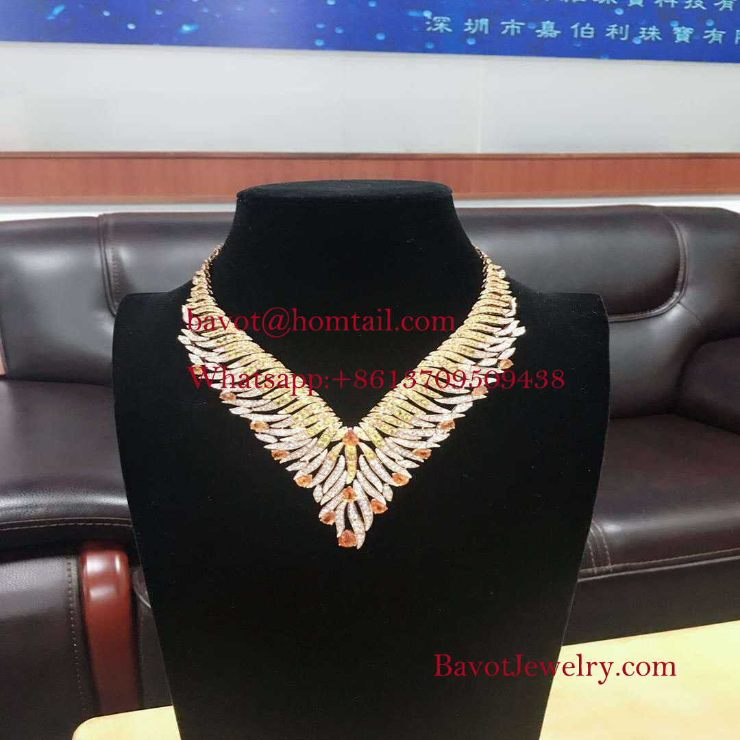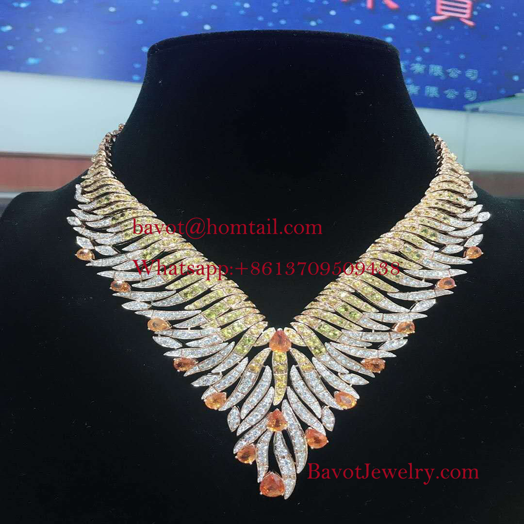 Rayons Précieux necklace and earrings come in yellow gold set with round-shaped diamonds. It reflects the colors of the sun through a mix of yellow diamonds and sapphires, in addition to pear-shaped mandarin stones that come in the color of vibrant orange.