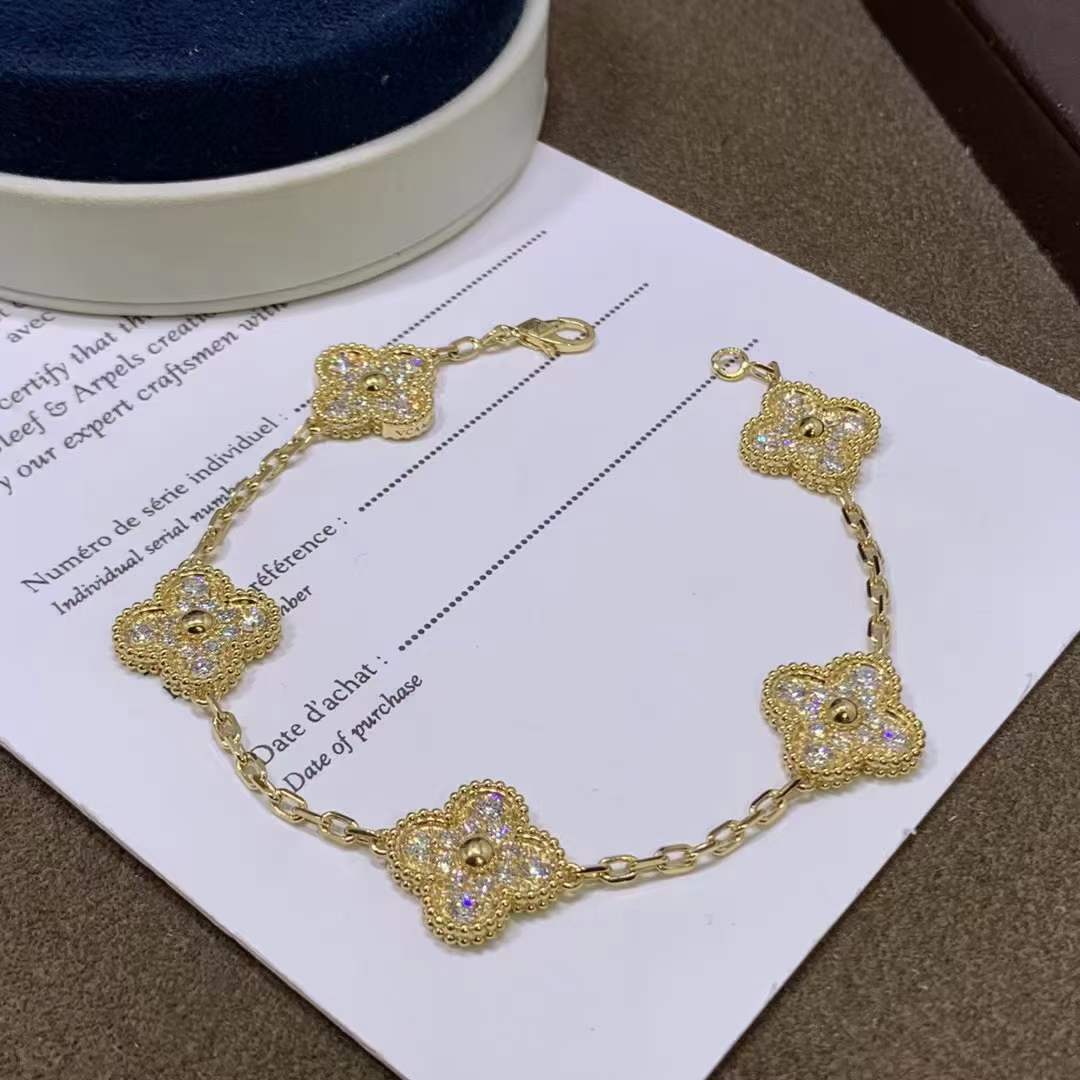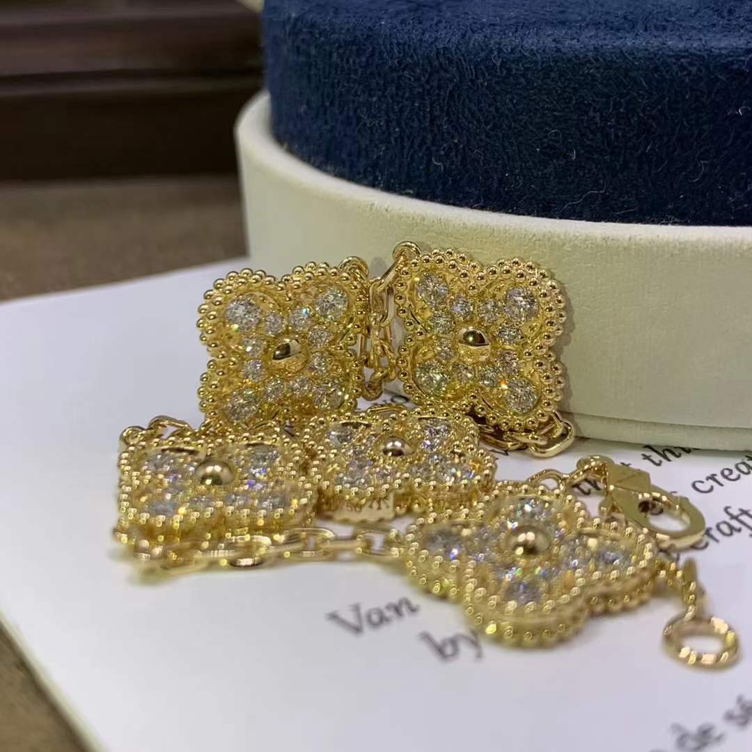 Vintage Alhambra bracelet, 5 motifs, yellow gold, round diamonds; diamond quality DEF, IF to VVS.